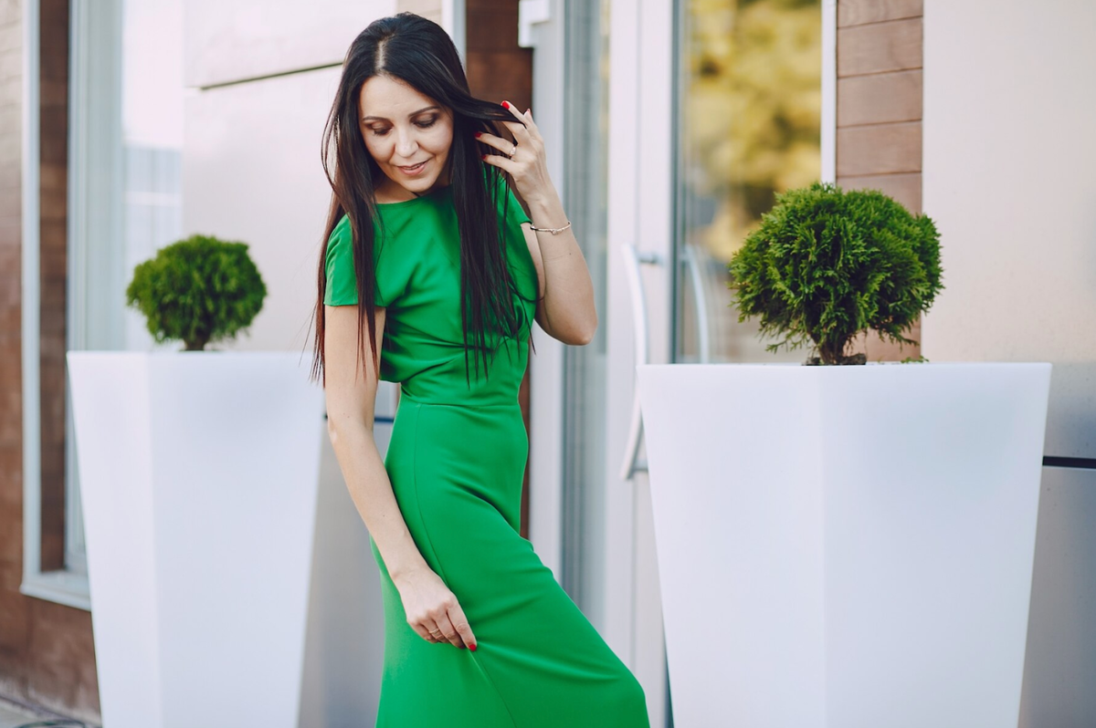 - Прохладные глубокие оттенки (изумрудный, травяной, хвойный) идеально подходят брюнеткам, делая образ благородным и выразительным.