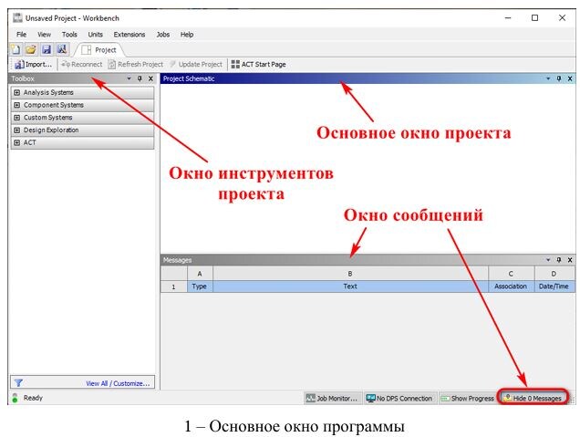 Запуск ANSYS Workbench выполняется из основного меню Пуск → Программы → ANSYS 2020 R2 → Workbench 2020 R2. После загрузки будет выведено основное окно программы, состоящее в свою очередь из нескольких окон, как показано на рисунке 1.