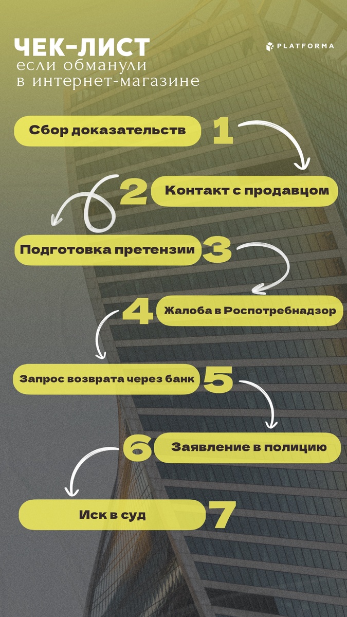 PLATFORMA составила чек-лист, в котором собраны шаги, которых следует придерживаться в случае неудачной покупки. Дочитаете до конца и сможете сохранить чек-лист в визуальном формате!