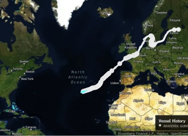 Нефтяной танкер «Академик Губкин», запечатленный 10 февраля 2025 года, по всей видимости, направляется на Кубу с грузом российской сырой нефти.