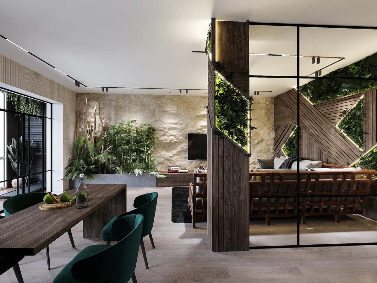 В студию Viz Diz обратилась молодая пара без детей с необычным запросом: создать интерьер "северной квартиры" в Петербурге с нотками культуры с острова Бали. О том, как мы воплотили эту идею, читайте в нашем материале. Заказчики — заядлые путешественники, вдохновленные культурой и стилем азиатских стран. Изначально они рассматривали варианты интерьера в духе Вьетнама, Таиланда или Японии. Однако в процессе разработки концепции наши дизайнеры предложили добавить нотки Бали с элегантными luxury-акцентами. Проект удалось удачно реализовать, но надо было постоянно помнить, что в Петербурге мало света и холодно. Азиатские мотивы, элементы декора, растения, принты и формы должны быть уместны. Важно было "не задавить" пространство квартиры. Гостиная и кухня. В основной зоне разместили диван с деревянным каркасом. На стенах - деревянные панно с подсветкой и стабилизованными растениями. Они выглядят как живые, но полив им не требуется. Они вымочены в глицерине и всегда свежи и зелены. Сте