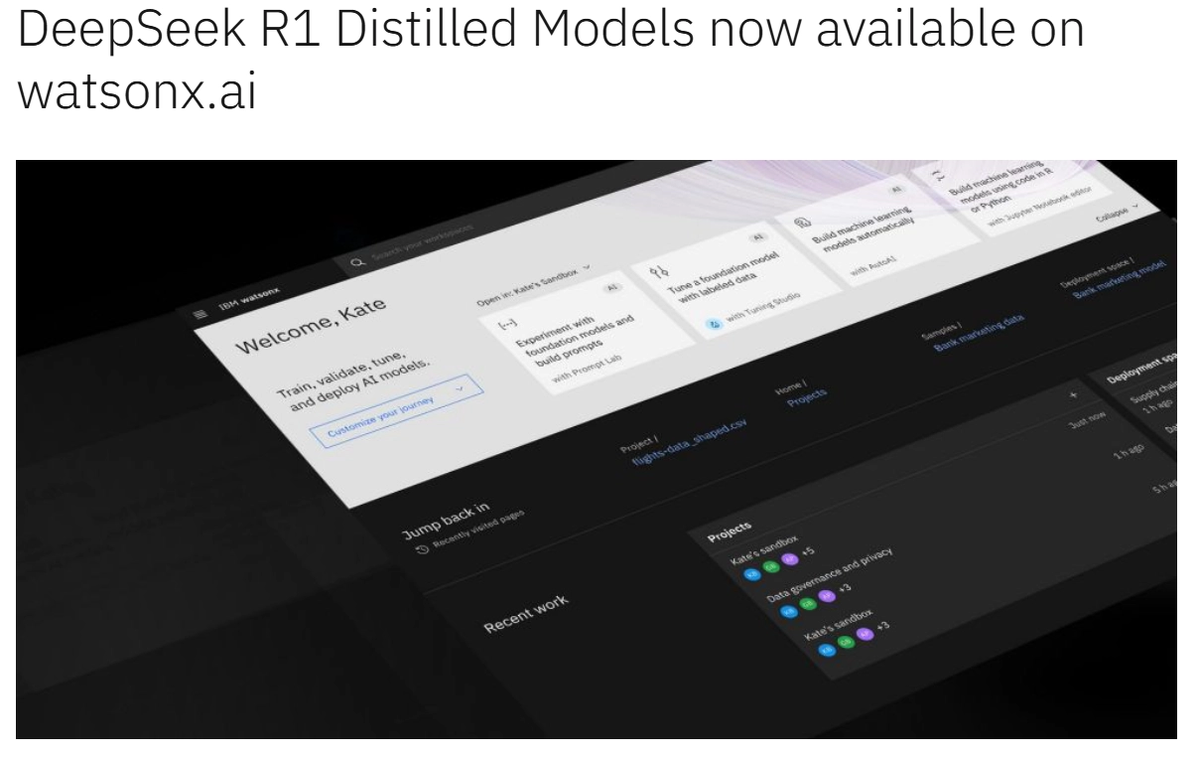 DeepSeek R1 использует технологию извлечения знаний для оптимизации различных вариантов Llama и Qwen. В каталоге watsonx.ai доступен Llama Distilled Edition, который предлагает пользователям возможность развертывания выделенных экземпляров для безопасного вывода. Также имеется функция импорта, позволяющая загружать другие варианты DeepSeek-R1, включая модель дистилляции Qwen.