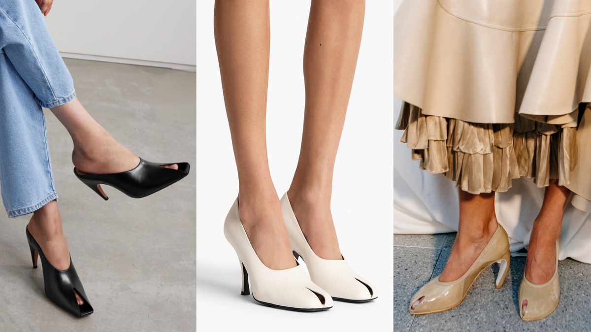 У Khaite туфли с круглым носком были разрезаны прямо по центру. Аналогичным образом, у Tory Burch туфли имеют консервативные вырезы прямо у больших пальцев ног. Эти два конкретных стиля, по нашим прогнозам, станут ключевыми покупками, когда появятся на рынке в следующем сезоне. А вот у Miu Miu и Prada силуэты были пропитаны ностальгией по версиям 2009 года, когда этот тренд был популярен в последний раз. А пары Prada вообще были взяты из архивов, включая версию осень-зима 2008.