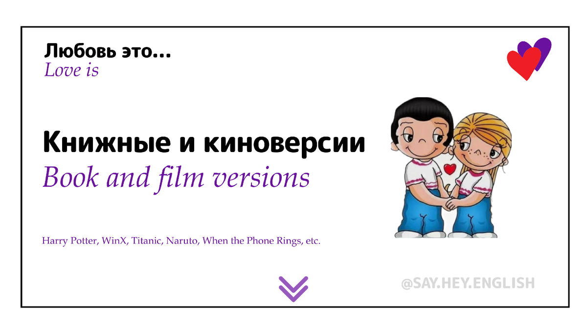 Все помнят легендарные жевательные резинки Love is, в которых всегда попадались разнообразные признания в любви и формулировки привязанности? В преддверии Дня всех влюбленных мы решили сделать похожую подборку, только от знаменитых пар из фильмов, сериалов, книг и мультфильмов. (как Школа иностранных языков, мы не могли не добавить перевода каждой фразы на английском, дабы совместить приятное с полезным) В комментарии не забудьте поделиться своими впечатлениями: есть ли тут ваши любимые пары? Кого бы ещё добавили? С какими цитатами? Ещё больше интересной и полезной информации по английскому и китайскому языкам читайте (и смотрите) у нас на канале. Также у нас есть инстаграм-аккаунт, в котором мы также публикуем интерактивные сторисы, полезные посты и развлекательные видео. А если вы хотите улучшить свои знания по английскому, то предлагаем записаться на занятия в нашу Школу Say Hey, где опытные преподаватели помогут разобраться раз и навсегда с этим иностранным языком!