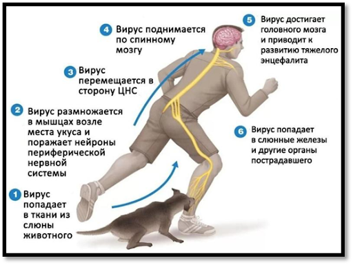 Бешенство передается через слюну зараженного животного, чаще всего через укус. Однако вирус может попасть в организм и через царапины, ссадины или слизистые оболочки (например, если слюна больного животного попадет в глаза, нос или рот).