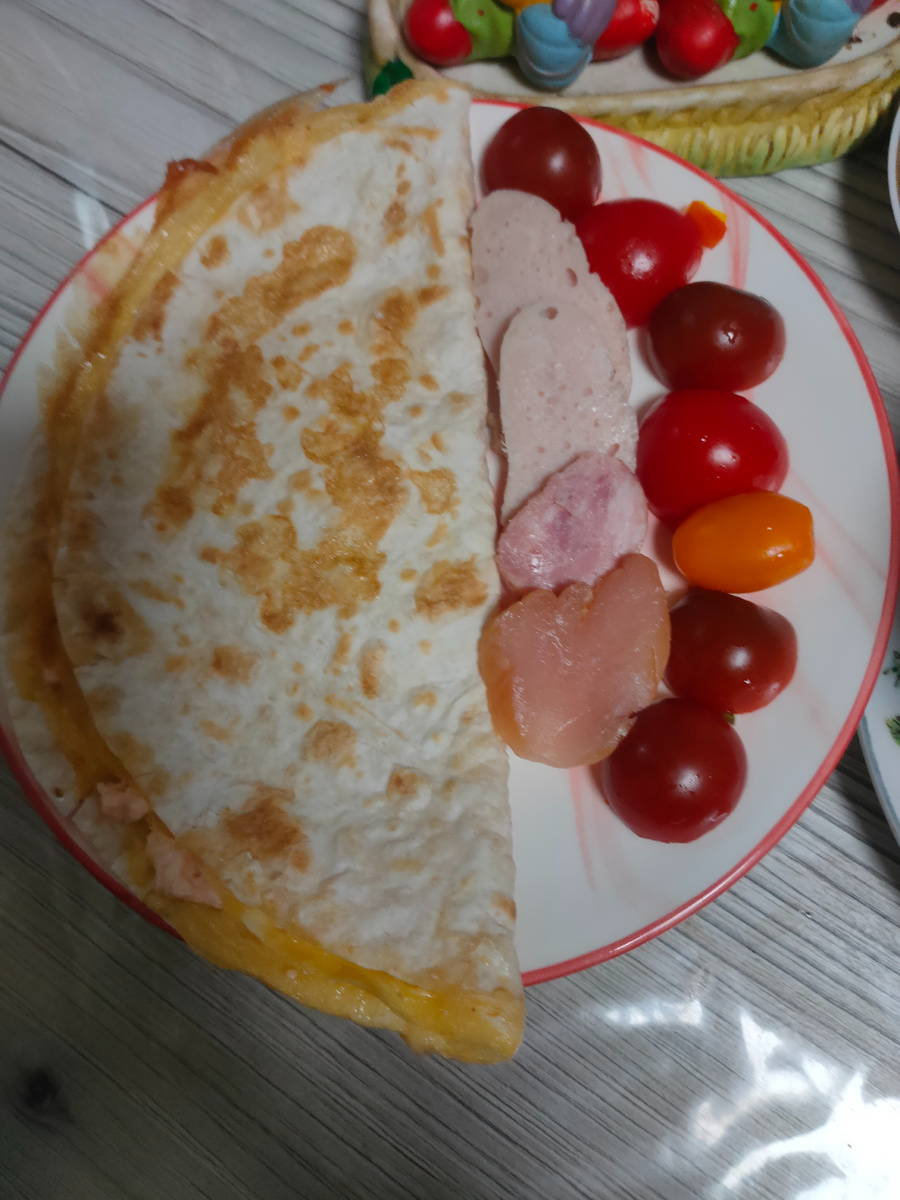Для завтрака приготовила следующие продукты: лаваш, яйцо, фреш мусс из креветок, натертый сыр. Яйцо хорошо размешала в миске с солью, вылила на сковороду, дала чуть - чуть схватиться, накрыла лавашем, придавила его, перевернула смазала муссом, присыпала тертым сыром, свернула пополам, обжарила с двух сторон. Завтрак готов: