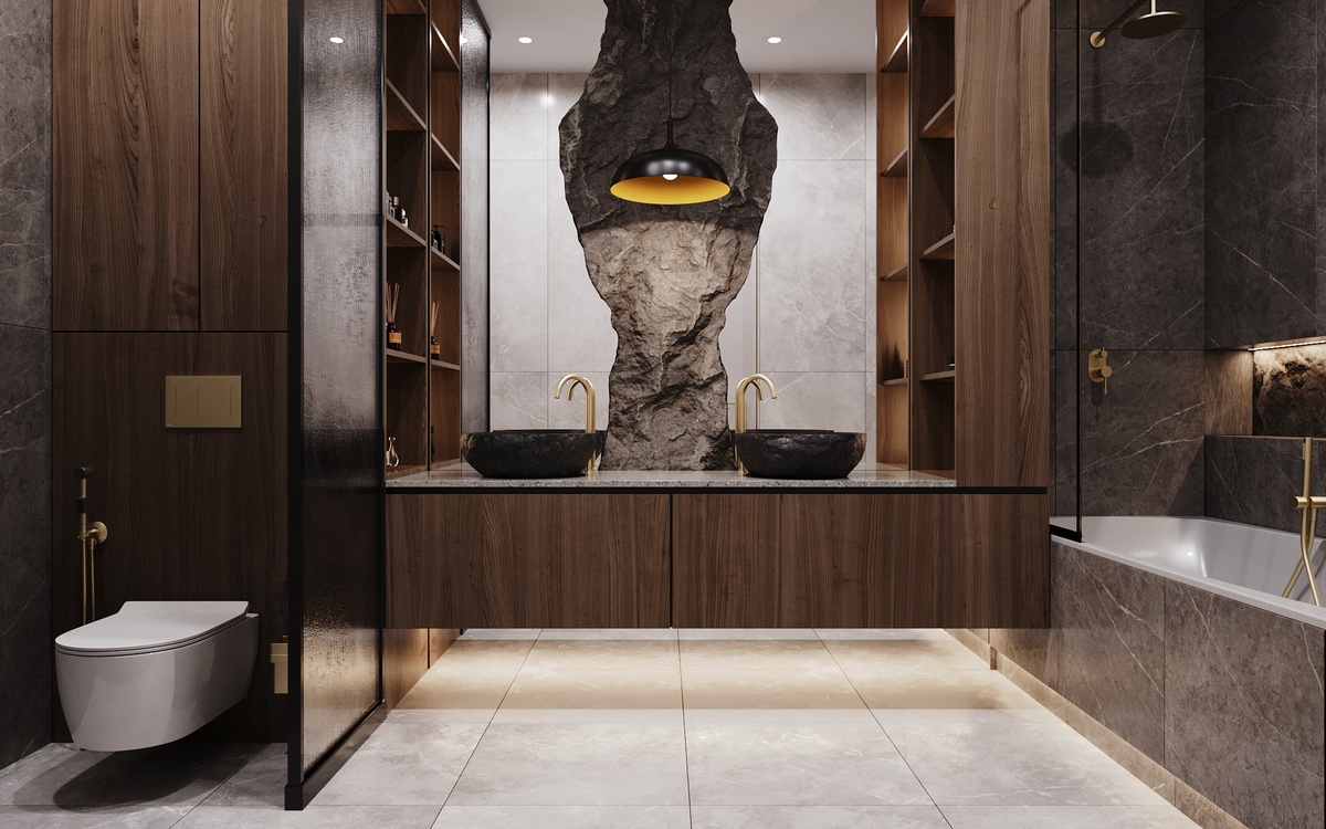 Золотые детали в сантехнике и стильные подвесные светильники добавляют особенный шик и современное очарование. Комфорт и релакс