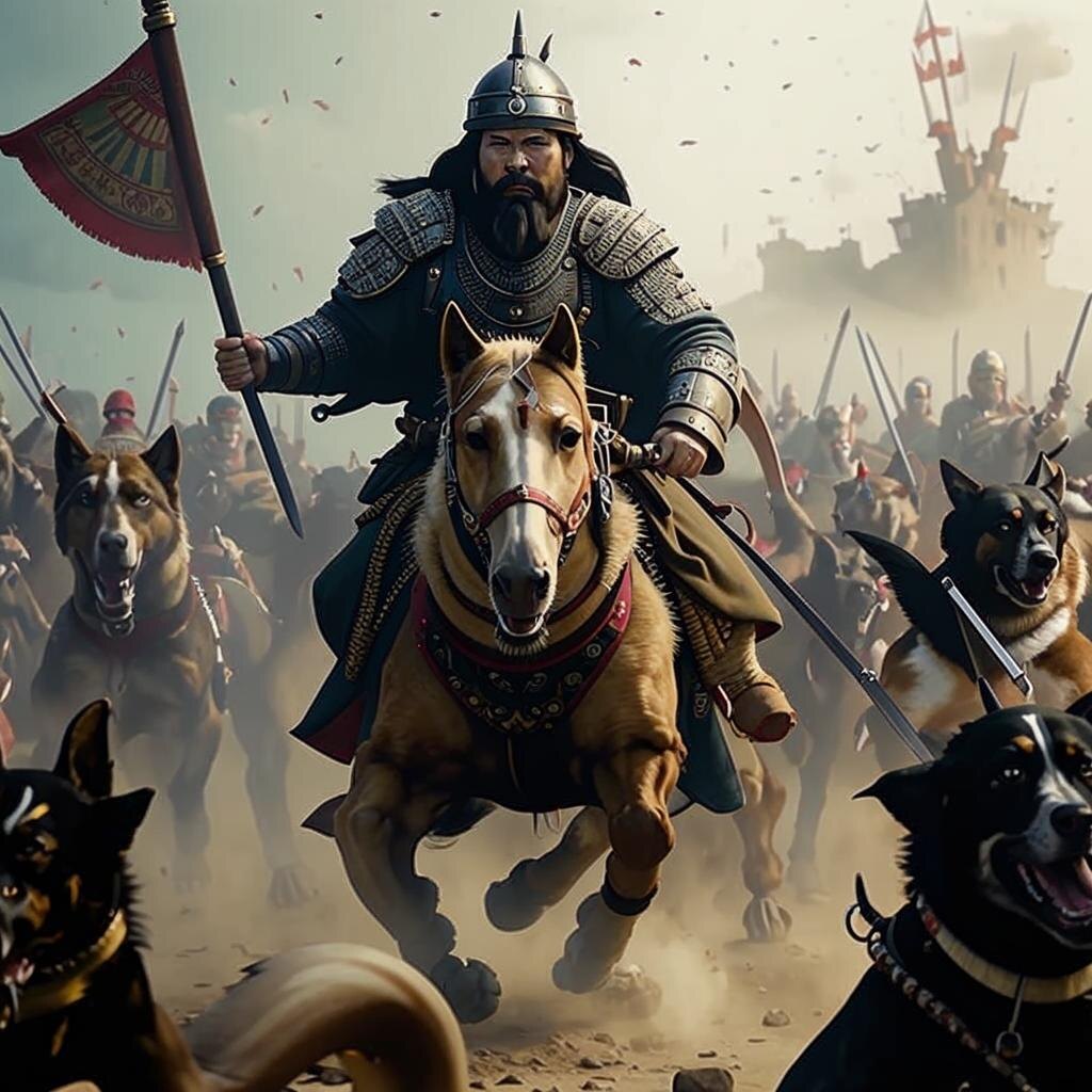 🐺⚔️ 1206 год. Империя от моря до моря Чингисхан только что объединил монгольские племена. Его конница, словно саранча, сметала города, а страх перед ним заставлял царей дрожать в спальнях. Но даже у величайшего завоевателя была **слабость**. И это не меч, не огонь, не предательство. Это... собаки. --- Почему Повелитель Страха боялся псов? 1. Проклятие детства. 🐕 В юности Тэмуджина (будущего Чингисхана) загнали на дерево дикие псы. Он провел там ночь, а после поклялся: «Лучше тысяча врагов, чем один пес у моего шатра». 2. Суеверия. Монголы верили, что собаки видят духов. Если пес воет на звезды — это предвещает смерть хана. 3. Тактика. Враги начали использовать своры псов против конницы. Чингисхан приказал: «Убивать всех собак на пути — они страшнее лучников!» Факт: В *«Сокровенном сказании монголов»* псы упоминаются 47 раз. Людей — втрое реже. --- Собачья месть: Как псы погубили империю – Самарканд, 1220. После резни в городе уцелели только бродячие псы. Они выли по ноча