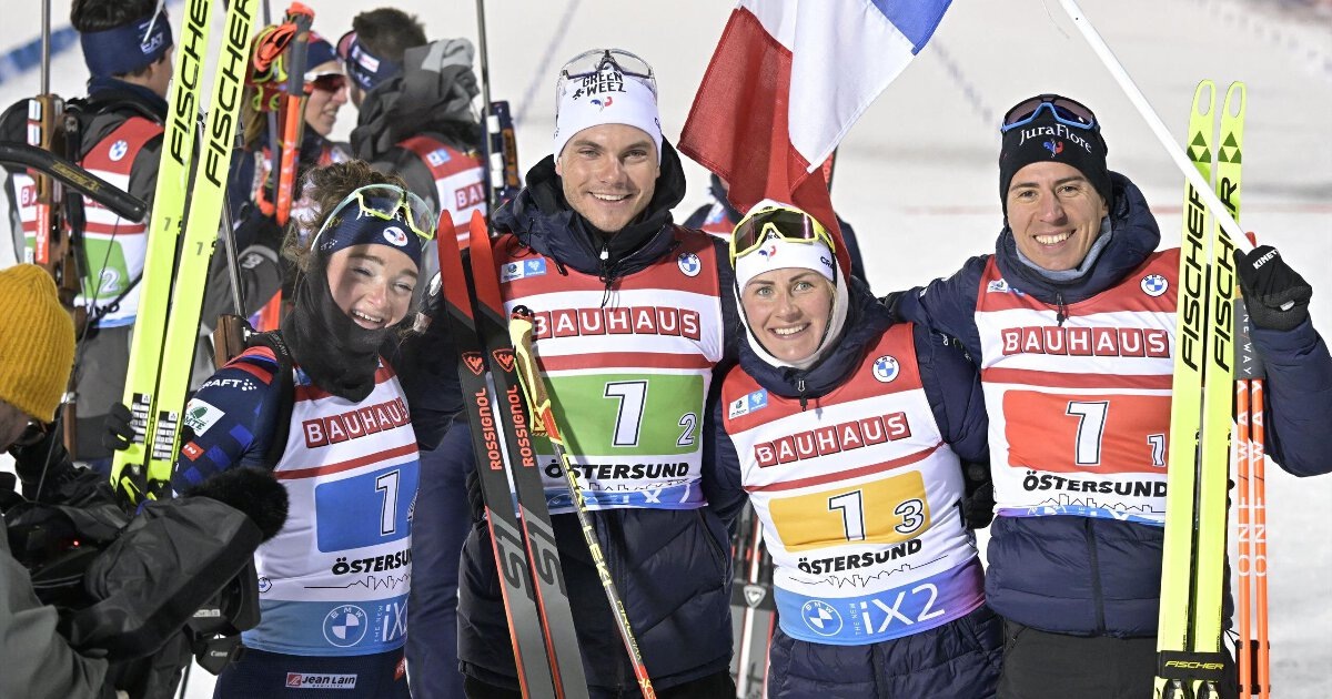 Чемпионат мира по биатлону-2025 Ленцерхайде, Швейцария Смешанная эстафета 1. Франция (Жюлия Симон, Лу Жанмонно, Эрик Перро, Эмильен Жаклен) – 1:04.41,5 (1+6) 2. Чехия (Джессика Йислова, Тереза Воборникова, Витезслав Горниг, Михал Крчмарж) – 1.13,8 (0+9) 3. Германия (Селина Гротиан, Франциска Пройс, Филипп Наврат, Юстус Штрелов) – 1.18,4 (0+11) 4. Норвегия (Ингрид Тандревольд, Марен Киркеэйде, Стурла Лагрейд, Йоханнес Бо) – 1.21,1 (2+8) 5. Швеция (Анна Магнуссон, Ханна Оберг, Мартин Понсилуома, Себастьян Самуэльссон) – 1.36,5 (1+10) 6. Швейцария (Эми Басерга, Лена Хекки-Гросс, Себастьян Штальдер, Никлас Хартвег) – 1.44,1 (0+11) 7. Италия (Ханна Аухенталлер, Доротея Вирер, Лукас Хофер, Томмазо Джакомель) – 2.41,2 (1+13) 8. Украина (Ирина Петренко, Кристина Дмитренко, Антон Дудченко, Дмитрий Пидручный) – 2.49,6 (0+5) 9. Финляндия (Суви Минккинен, Соня Лейнамо, Теро Сеппяля, Олли Хииденсало) – 2.52,3 (1+4) 10. Бельгия (Лотте Ли, Майя Клутенс, Тьерри Ланже, Флоран Клод) – 3.20,0 (1+12) 11.
