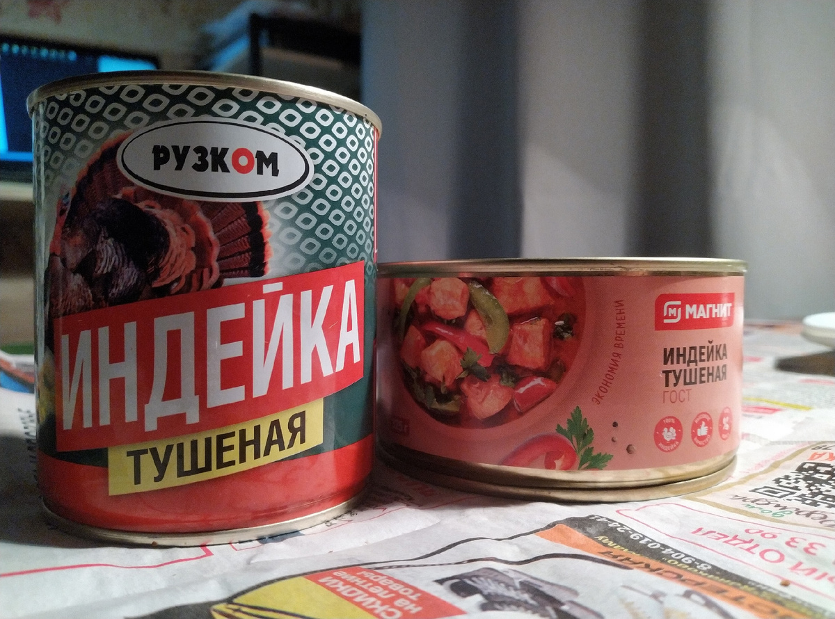 Уважаемый канал «Вилка бюджетника» как то недели с две назад написал, что в «Гамните», мол, хорошая индюшачья тушенка по 130 рублей. Я ответил, что в Фиксе за 79 тоже норм, правда баночка маленькая. Потом я пошел в ближайший Гамнит искать эту индюшачью тушенку. В первом ее не было, во втором я увидел пиво по акции и про нее забыл. А в третьем (уже после пива) – таки, нашел. По 139 рублей. Ну а маленькая тушенка у меня уже с месяц в холодосе томилась. Сегодня решил сравнить. В общем-то, сравнение будет довольно кратким. Итак, две «Индейки тушеные». Первая 290 грамм от МПЗ «Лыткаринский». Вторая уже 325 грамм и тоже от МПЗ «Лыткаринский». В составе и там и там имеем: мясо идейки, вода, соль, лук, загуститель, черный перец. Маленькая открывается обычной открывашкой (она же нож консервный), в той, что побольше, ради удобства предназначен, так называемый, ключ. Вскрыл – заценил. Вид, аромат и вкус – идентичны. Приличное количество жира (но индейского мяса тоже хватает), есть некоторое коли