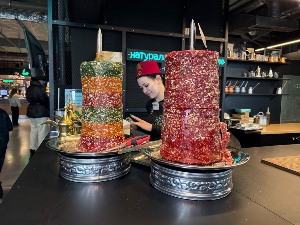 Разрывающую Тик Токи сладость выкатили в кафе «Файруз», где кроме неё с десяток аномально сладких аутентичных турецких десертов. Да, именно там варят кофе на песке и отливают дубайский шоколад. Предупреждаю, зрелище не для слабонервных, сей десерт поднимет уровень сахара в крови, самый смак наблюдать, как фруктовую шаурму нарезают с вертела. А что, если завернуть её в лаваш и залить лимонным соком? В какую психушку, вы чё, угораете что ли?! Следы вывели на «Конкорс» в турецкую лавку сладостей. Для фанатов шаурмы, за ней чуть дальше топово крутят кебабы в чесночном соусе. На холодном вертеле сегодня: шишка гранатовой шаурмы и слоёная из киви, апельсина и снова граната. Говорят, что варят её из разных соков с сахаром, загустителем, с добавлением орешков. Подают с кислыми соусами: гранатовым или лимонным. Интересно, как её называют турки? За микс вышло 9,50р. Эта штука на 100% сладкая, кислый соус пытается нивелировать, но получается ещё слаще. Ощущается киви, апельсин и гранат. По вкусу,