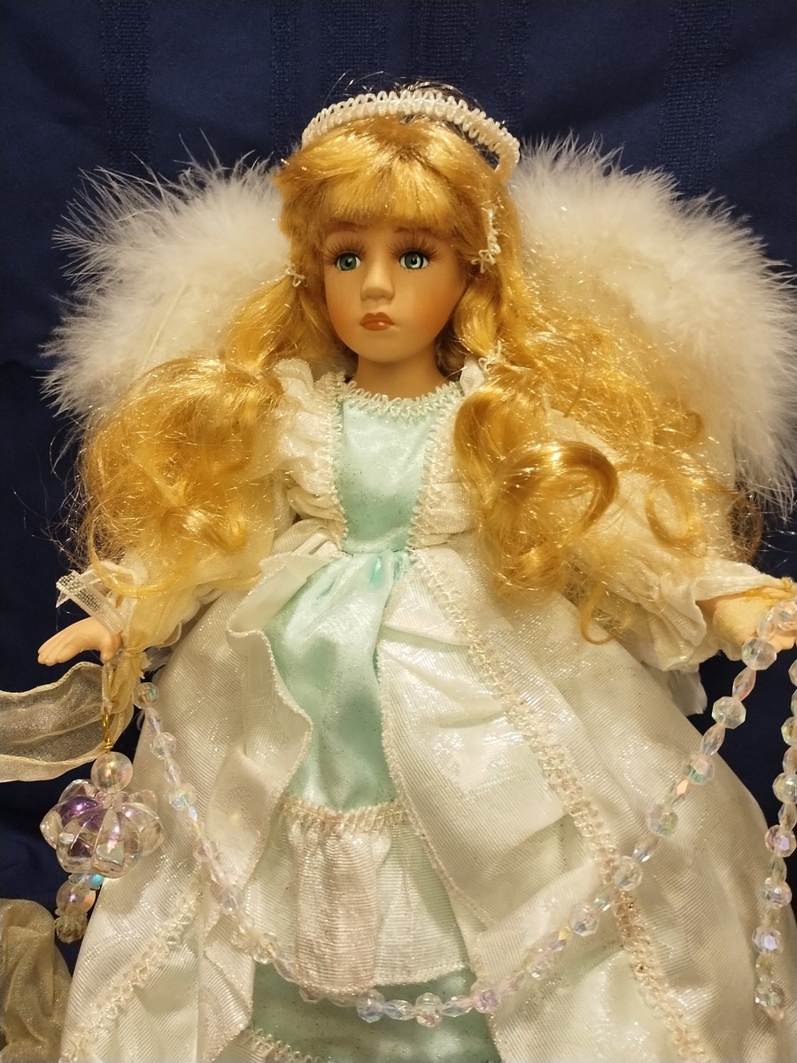 Всем доброго дня! У меня в коллекции несколько кукол- Ангелов,- сегодня я хочу вам показать двоих, которые в чем-то похожи, фактурой, дизайном, размерами и возрастным цензом. Они обе представляют как бы взрослых девушек,- а еще есть куклы- Ангелы как бы маленькие девочки, малышки. Такие у меня тоже есть, я их покажу позже, отдельно. Первая кукла-Ангел в бело-голубом платье, красиво украшеном лентами и кружевами, в руках она держит хрустальные четки, а за спиной у нее, как и положено Ангелу- белоснежные крылья. Эта кукла блондинка с выразительными зелеными глазами Вторая кукла- Ангел в розовом платье, также украшеном с лентами и кружевами- но у нее нет крыльев! Она утеряла свои Крылья- и поэтому теперь она Падший Ангел. Ну это я так решила. Для красоты истории. А вобще кукла тоже очень красивая и оригинальная. И крылья, конечно, у нее тоже изначально были- но предыущий хозяин видимо, куклу не очень хорошо содержал, а может утерялись уже в магазине, вобщем- когда я ее купила- уже