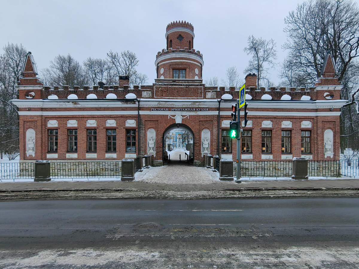 Рассказывая об исторических зданиях Пушкина, в которые можно попасть не в группе экскурсантов, а в качестве посетителя кафе/ресторана, ранее я упомянул про Певческую башню. Сегодня решил, в том числе с целью трапезы, заглянуть в исторический павильон "Эрмитажная кухня". Историческая справка Здание, которое являлось "Эрмитажной" кухней и одновременно служило въездными воротами в парк ("Красные ворота"), было построено в 1755 году по проекту архитектора В.И. Неелова. Новая каменная кухня в псевдоготическом стиле была возведена на месте старой деревянной. Это красивое строение всегда выполняло свои прямые функции. В советское время здесь находилась столовая, которая обслуживала посетителей парка. Затем некоторое время в нём размещалось кафе. Сейчас здесь находится ресторан "Эрмитажная кухня", где в туристический сезон, наверное, не протолкнуться. А вот в будний февральский день практически никого не было. Ресторан занимает правую часть исторического здания. В нём имеется два помещения