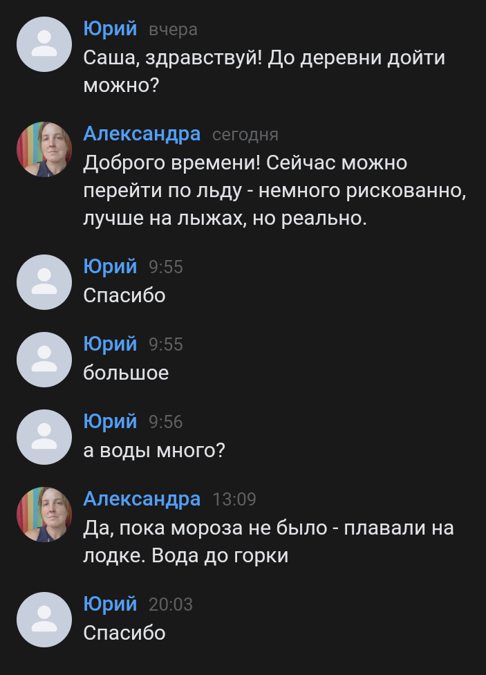 Наша захлёбина - такая захлёбина, такая вся непредсказуемая. Как раз вчера меня спрашивал об этом сын давно почивших жителей нашей деревни, который иногда приезжает в родительский дом. С утра так и было - можно было перейти по льду. А потом бац - и приехал на рыбалку Сан Саныч с приятелем на своём вездеходе. Виновато сказал: "Мы вам там немножко дорогу поломали". То есть, вездеход проломил лёд, и приплыл сквозь айсберги. Это - ничего, на самом деле это даже хорошо, потому что вода быстро спадает, и подо льдом образуются пустоты, что не добавляет ему надёжности, а после вездехода плавающие льдины склеятся в новый прочный однослойный лёд - прямо специально для меня к пятнице или субботе. Но если бы Юрка сегодня приехал, надеясь попасть в деревню по льду - он бы очень обломался. А если бы перешёл по льду утром, чтобы навестить свой дом, то застрял бы тут на пару дней, хотя, казалось бы, ничто не предвещало. Случалось, что люди приезжали в деревню на выходные по хорошей сухой дороге, а по
