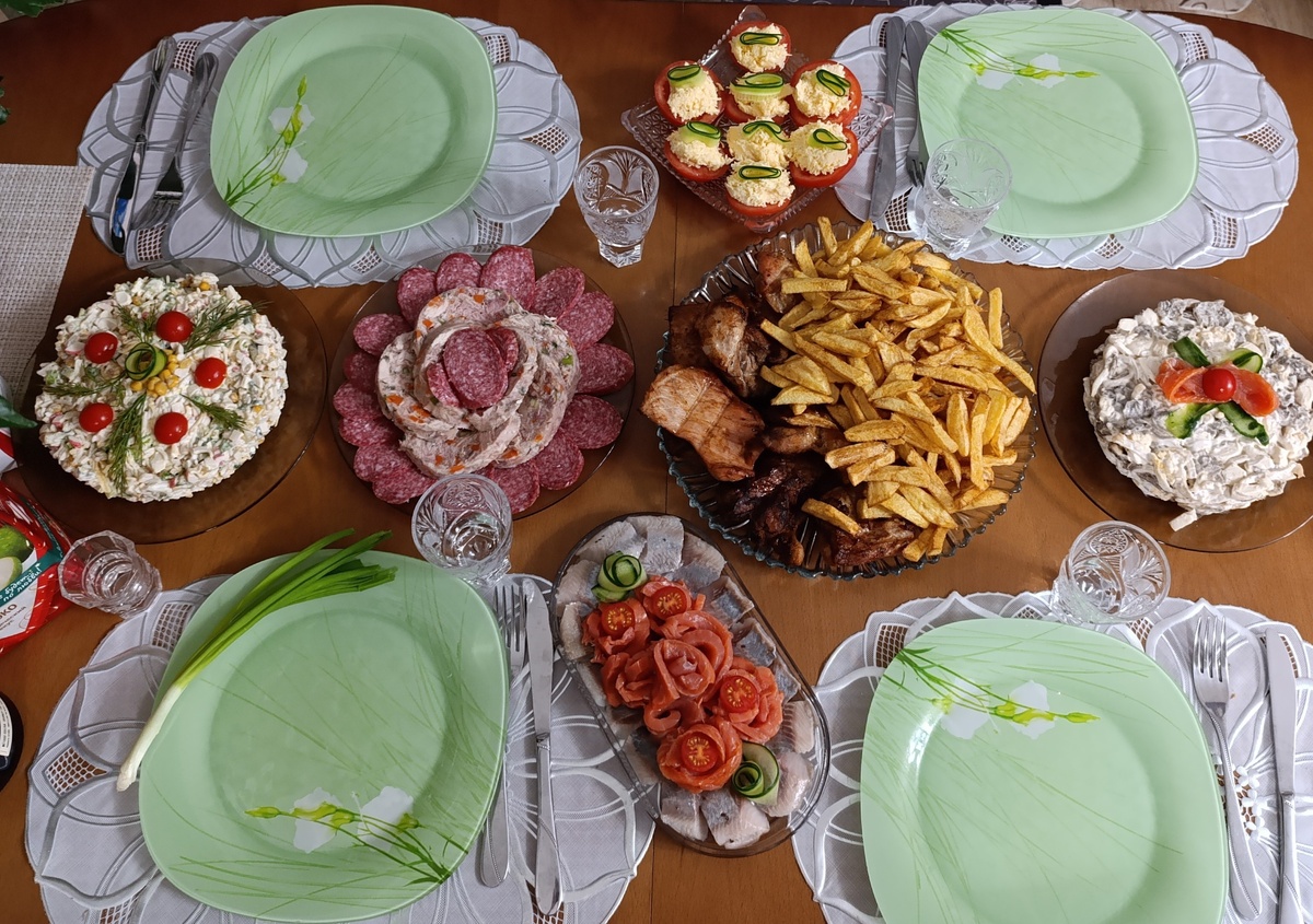 Доброго времени суток! Вот и наступило время того самого праздничного домашнего ужина! Наступило время семейного праздника, который выпал на середину недели. Отметить хочется и нужно, но.... что делать, когда хозяйка работает до поздна? Как я и говорила ранее, времени на приготовление всего навсего у меня было 40 минут. С работы вернулась уже в девятом часу вечера. Все хотят кушать!!!!! Чуть с порога не съели!!! :))))))))) По моему, это многим знакомо...... Как хорошо, что были сделаны предварительные заготовки: плавали и знаем!!!! (о предварительной работе можете почитать здесь). Итак, за 40 минут я успела сделать: Салат "Кальмарчик" Салат из крабовых палочек Нарезка из колбасы и куриного рулета Рыбная нарезка Сырная тарелка Помидорчики с сыром Картофель фри и стейки Ужин по настоящему получился теплым, домашним и праздничным! Фото представляю как есть, по-домашнему. Не судите строго за неровно поставленную посуду, приборы, "быстрые" украшения блюд. За спиной стояли и облизывались! :)