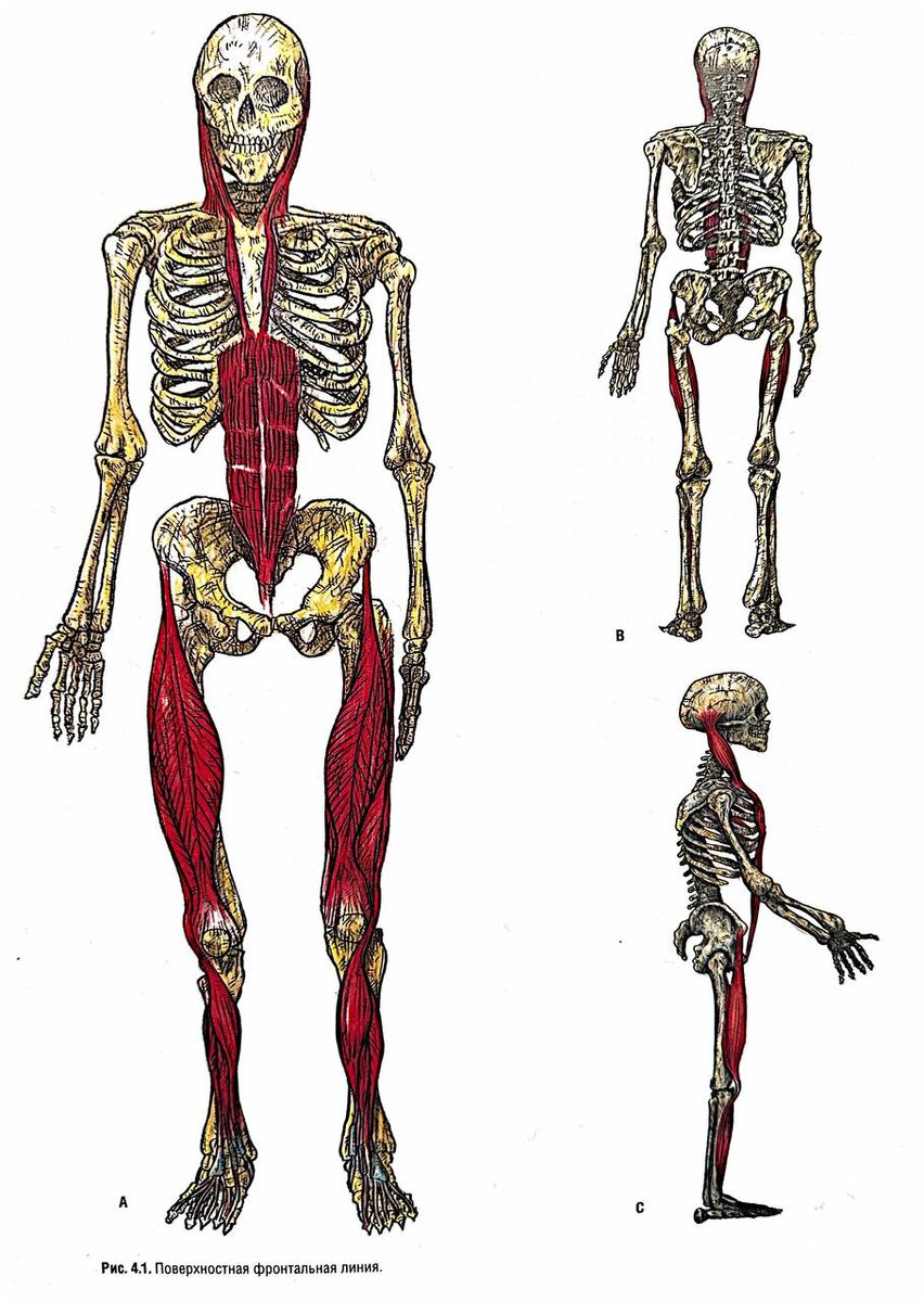 Поверхностная фронтальная линия соединяет всю переднюю поверхность тела от верхней поверхности стоп до боковых сторон черепа. Объединение происходит в два участка - от пальцев стопы до таза и от таза до головы. Главная функция ПФЛ состоит в том, чтобы удерживать равновесие с Поверхностной задней линией (ПЗЛ). А так же подтягивать и поднимать те части скелета, которые продлевают линию гравитации - лобковая кость, грудная клетка и лицо. Часто встречается такой паттерн, при котором ПФЛ стягивается книзу на передней стороне тела, в то время как ПЗЛ поднимается вверх по спине. Мы видим это в саггитальной плоскости на фото. Так создается перекос между соответствующими структурами передней и задней частей тела и закладывается «фундамент» целого ряда будущих проблем в области шеи, верхних конечностей, нижнего отдела спины и проблем с дыханием. Одно из корригирующих упражнений с бищенэ для восстановления баланса ПФЛ и ПЗЛ представлено на этом видео. Отрывок и фото из книги Т.Майерса «Анатомичес