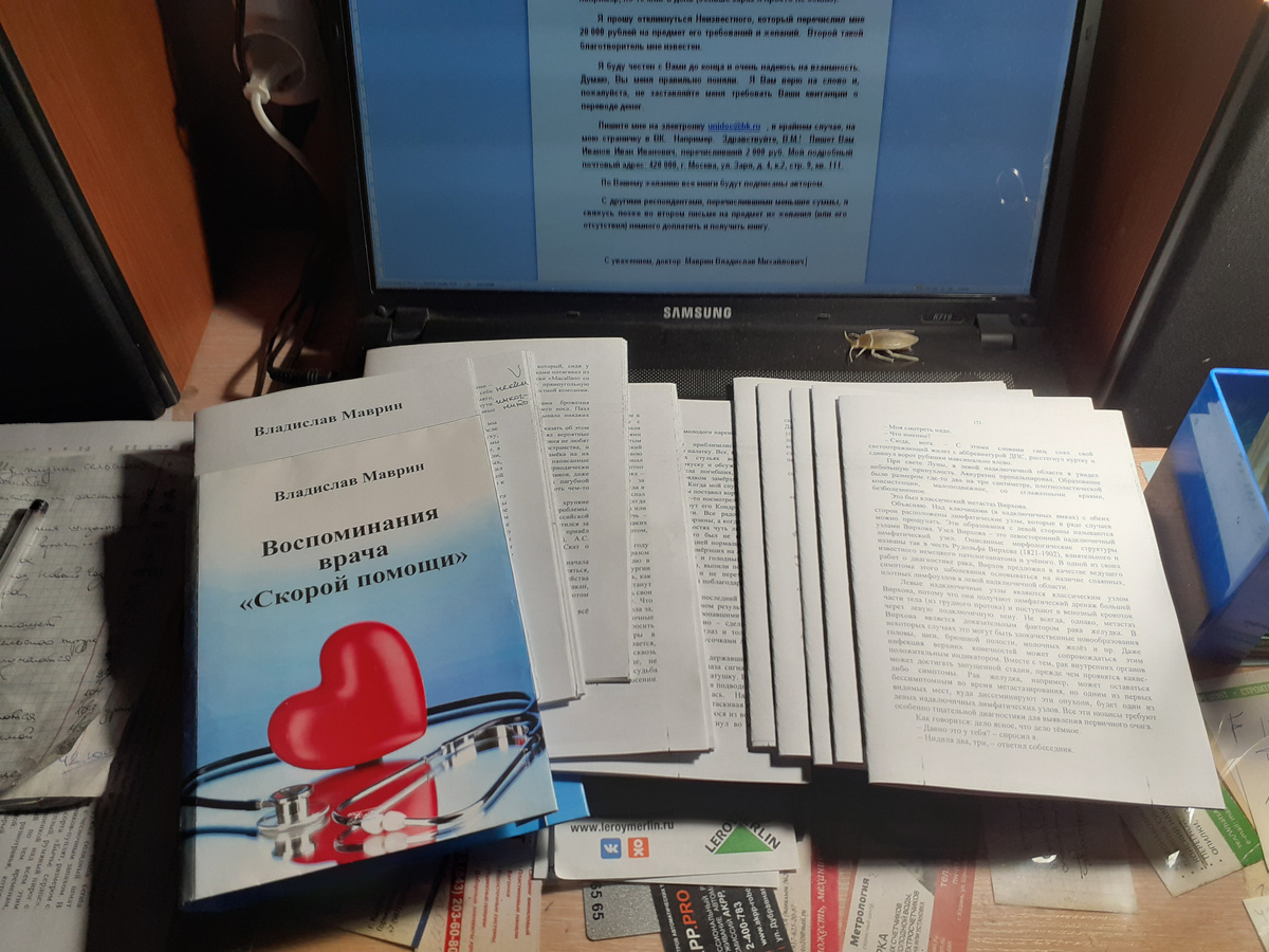 ПИСЬМО I Здравствуйте, уважаемые читатели и подписчики моего нового канала «Доктор Слава 2» и старого «Доктор Слава»! Так как у меня находятся Ваши деньги на издание книги «Воспоминания врача «Скорой помощи», считаю необходимым проинформировать Вас о положении дел в этом вопросе. В настоящее время я читаю и правлю макет книги. То есть, она отпечатана в черновике, другим шрифтом, на отдельных листочках. В связи со сменой шрифта, как правило, возникает определённое количество разнообразных ошибок. Пока я правлю книгу, продвигается моя очередь на её окончательную печать. На сегодняшний день я прочитал и исправил только половину книги, но к концу февраля уже должен отнести её в типографию. Будем считать, что всё идёт по графику – мы не опаздываем, но и не торопимся. В последнее время я стал получать письма от читателей и подписчиков забронировать ему (ей) один (несколько) экземпляр (ов) книги. В ответ я пишу, что для этого необходимо перечислить мне на карту 2 000 (две тысячи) рублей (сто