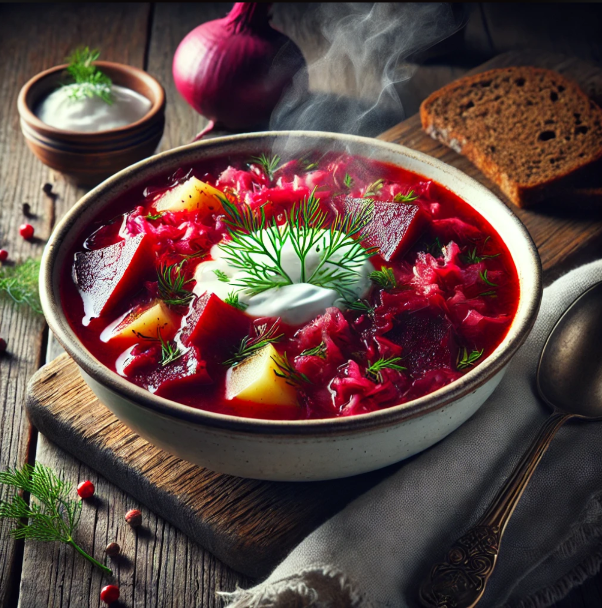 - Подача: Борщ подается не только с сметаной, но и с ржаным хлебом, который прекрасно дополняет его вкус.
