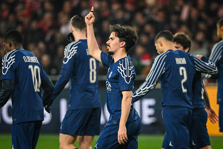 3:0 с «Брестом». «ПСЖ» разгромил «Брест» в гостях – 3:0. Идеальный старт парижан в плей-офф Лиги чемпионов – с очередным дублем Усмана Дембеле. Дембеле не остановить: 15 голов в восьми матчах! «Брест» получил от него пять Сначала «Париж» забил с пенальти. Полузащитник «Бреста» Пьер Ле-Мелу рукой заблокировал удар Дембеле на 17-й минуте. Витинья неспешно подошел к точке и реализовал. А ведь летом 2024-го игроки «ПСЖ» конфликтовали из-за пенальти. Луис Энрике назначил Витинью единственным исполнителем и вызвал этим массовое недоумение в команде. Нападающие «ПСЖ» считали, что ответственность за пенальти должны брать они – тогда тренер пошел на компромисс, но теперь Витинья вновь забивает с точки. «Брест» огрызался и даже почти сравнял. Абдалла Сима за минуту чуть не улизнул от защитника Вильяна Пачо и попал в штангу – в двух разных моментах. Хозяева достойно смотрелись, но «ПСЖ» на 45-й минуте удвоил: Усман Дембеле подошел к штрафной и стильно положил в ближний. Во втором тайме Дембеле сд