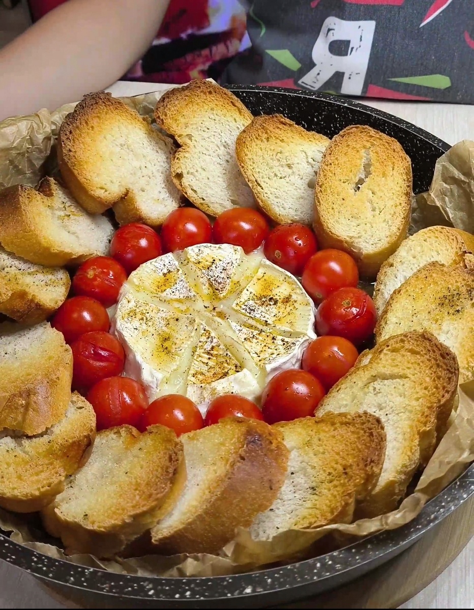 - 1 сыр с плесенью, круглый (я беру Président, но можно любой на Ваш вкус ) - 14 помидорок черри (у кого сыр объемнее, тогда и помидорок побольше ) - 4–5 зубчиков чеснока (чтобы было вкусно, но не слишком вампирски) - 1 багет (лучше хрустящий, а не тот, который захрустел от того, что лежит уже два дня) - 2 ст. л. заправки с французскими пряностями и чесноком (или просто что-то ароматное) 1. Нарезаем сыр по диагонали, как циферблат часов – пусть время идёт во вкусную сторону. 2. Чеснок режем кружочками и прячем в разрезы сыра – пусть каждый кусочек будет ароматным. 3. Укладываем пергамент на противень, кладём сыр в центр – пусть почувствует себя звездой вечера. 4. Вокруг сыра выкладываем помидоры черри, организуем им дружный красный хоровод. 5. Нарезаем багет и отправляем его в следующее кольцо вокруг помидорок. 6. Поливаем всё заправкой. Если нет французской – не беда, добавьте то, что есть, и просто говорите с блюдом с французским акцентом. 7. Отправляем в духовку