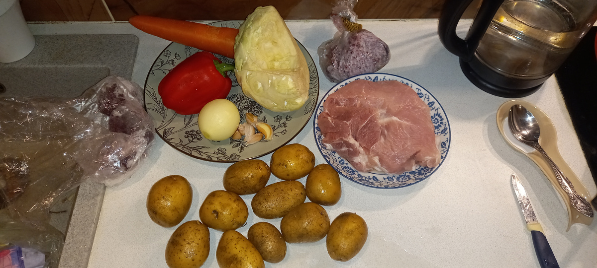 Смеркалось. Обычный вторник. Приехал с работы, поужинал, проверил уроки... 21:00 Самое время приготовить борщ ) Лук, чеснок, морковь, свекла, капуста, перец, картофель, мясо, зелень. Нарезал мясо небольшими кусочками , в холодную воду и на плиту. Лучше говядина или баранина на кости, но у меня сегодня была только свинина. Баранина или говядина, как закипит, должна потомиться 3 часа. Свинина - 30 минут. Сразу добавляю немного приправы...любой, какая есть...соль и немного сахара. Когда мясо потомилось - добавляю капусту. Закипело. 15 минут и добавляю морковь. Закипело. 10 минут и добавляю картофель. Закипело - добавляю свеклу. Теперь варится до готовности картофеля, а тем временем готовлю поджарку. Обжариваю лук, чеснок, морковь. Немного болгарского перца и томатную пасту. Обжариваю и немного воды. Кипит минуты 3. Когда картофель почти готов добавляю перец. 5 минут кипит и добавляю поджарку и зелень. 5 минут кипит и готово. ПРИЯТНОГО АППЕТИТА!