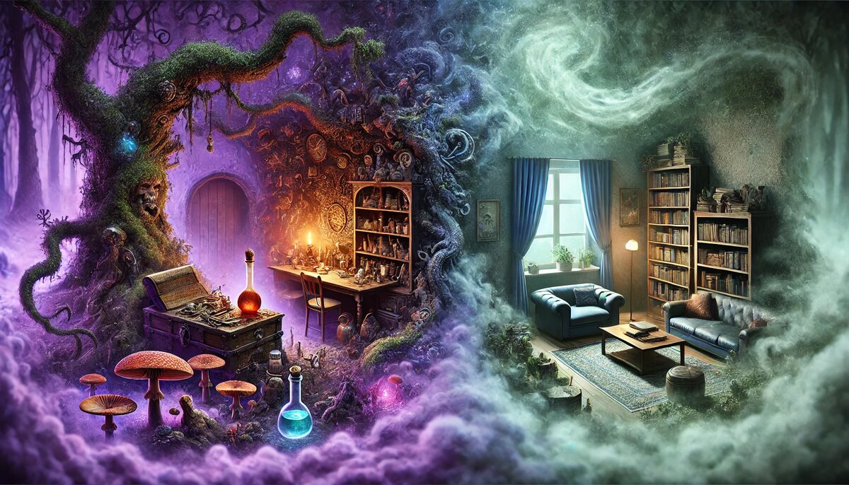 Похоже логово карги уже близко. Осторожно пробираясь по заросшим мхом и грибами коридорам, Филомина и Алистер попали в просторное помещение, в котором болотистая земля переходила в твёрдую почву. В дальнем углу располагалась деревянная лестница вела на балкон второго этажа, где виднелась дверь. Повсюду росли грибы и торчали коряги. Справа из трещины в потолке падал солнечный свет на круг из грибов.