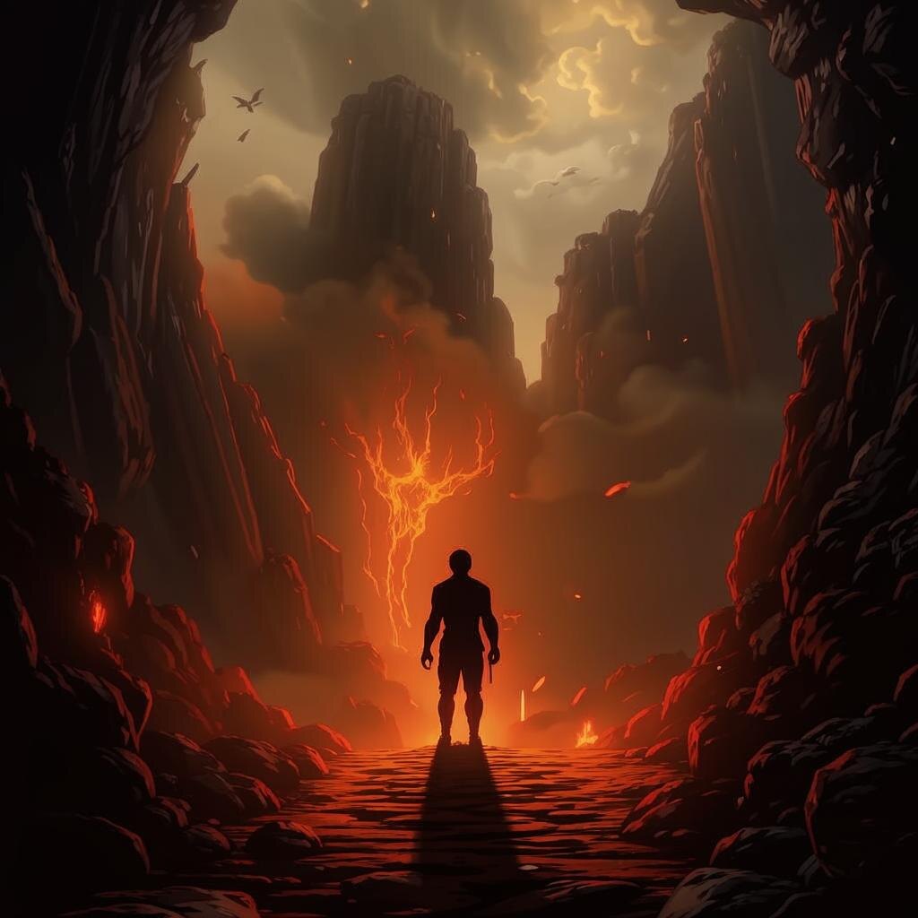 Он стоял на краю пропасти, глядя вниз, в бездну, откуда поднимался жар и дым. Огонь плясал внизу, освещая мрачные скалы и тени, что скользили между ними. Это было начало его пути, первый шаг в неизведанное.
