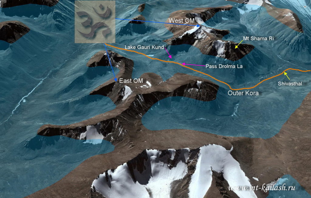 Ранее мы писали, что на пути внешней коры вокруг г. Кайлас у перевала Дролма Ла есть место, где вибрации Звука Первотворения проявлены в формах горного рельефа: двух горных хребтов в форме древнего ведического символа ОМ, имеющих центр симметрии в озере Гаури Кунд (1,2).