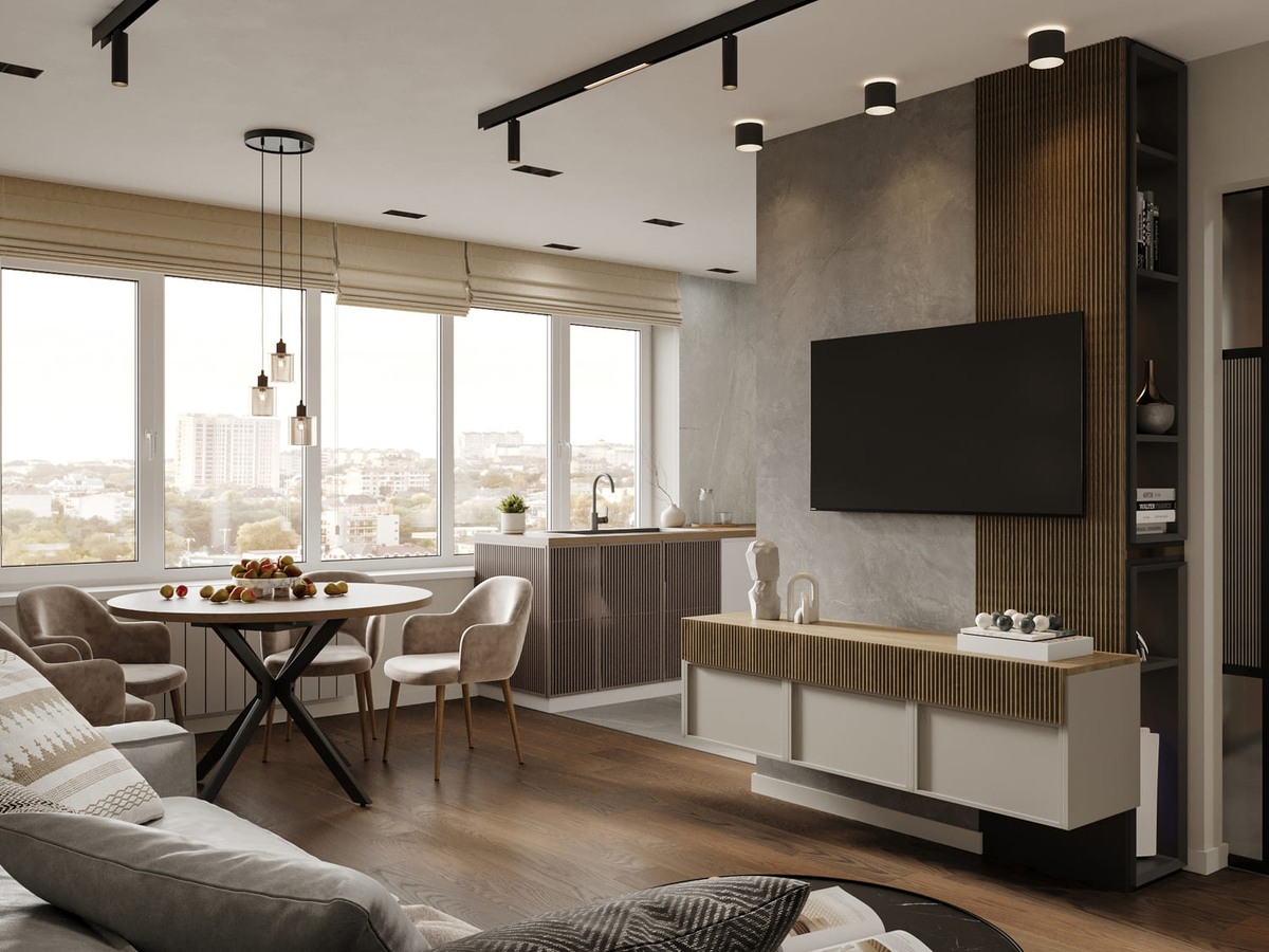 - Панели с реечной отделкой добавляют интерьеру уюта и динамики, а минималистичные фасады шкафов делают пространство визуально чистым и современным.