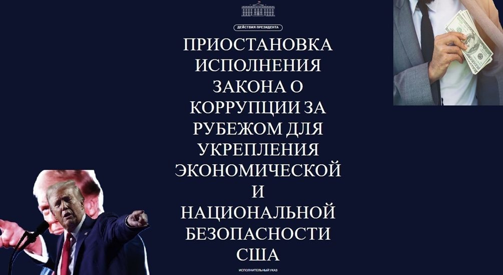 Дональд Трамп продолжает пытаться продемонстрировать свою полную приверженность предвыборному лозунгу «Америка прежде всего». На сайте вашингтонского Белого дома официально опубликован его указ, приостанавливающий действие Закона о борьбе с коррупцией за рубежом (Foreign Corrupt Practices Act, FCPA).