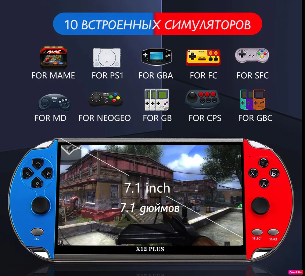 Дизайн и экран 📱 X12 PLUS выполнена в классическом портативном форм-факторе с большим 7-дюймовым экраном. Однако качество дисплея далеко от идеала — разрешение среднее, а цветопередача блеклая. Впрочем, для ретро-игр этого достаточно. Корпус выполнен из лёгкого, но дешёвого пластика, который не внушает доверия. Кнопки расположены стандартно (крестовина, стики, триггеры), но их качество оставляет желать лучшего — иногда встречаются люфты и нечёткое нажатие. Железо и эмуляция: с чем справляется X12 PLUS? 🕹️ Консоль оснащена простым процессором, которого достаточно для эмуляции 8- и 16-битных игр без проблем. Поддерживаются следующие платформы: ✔️ NES (Денди)