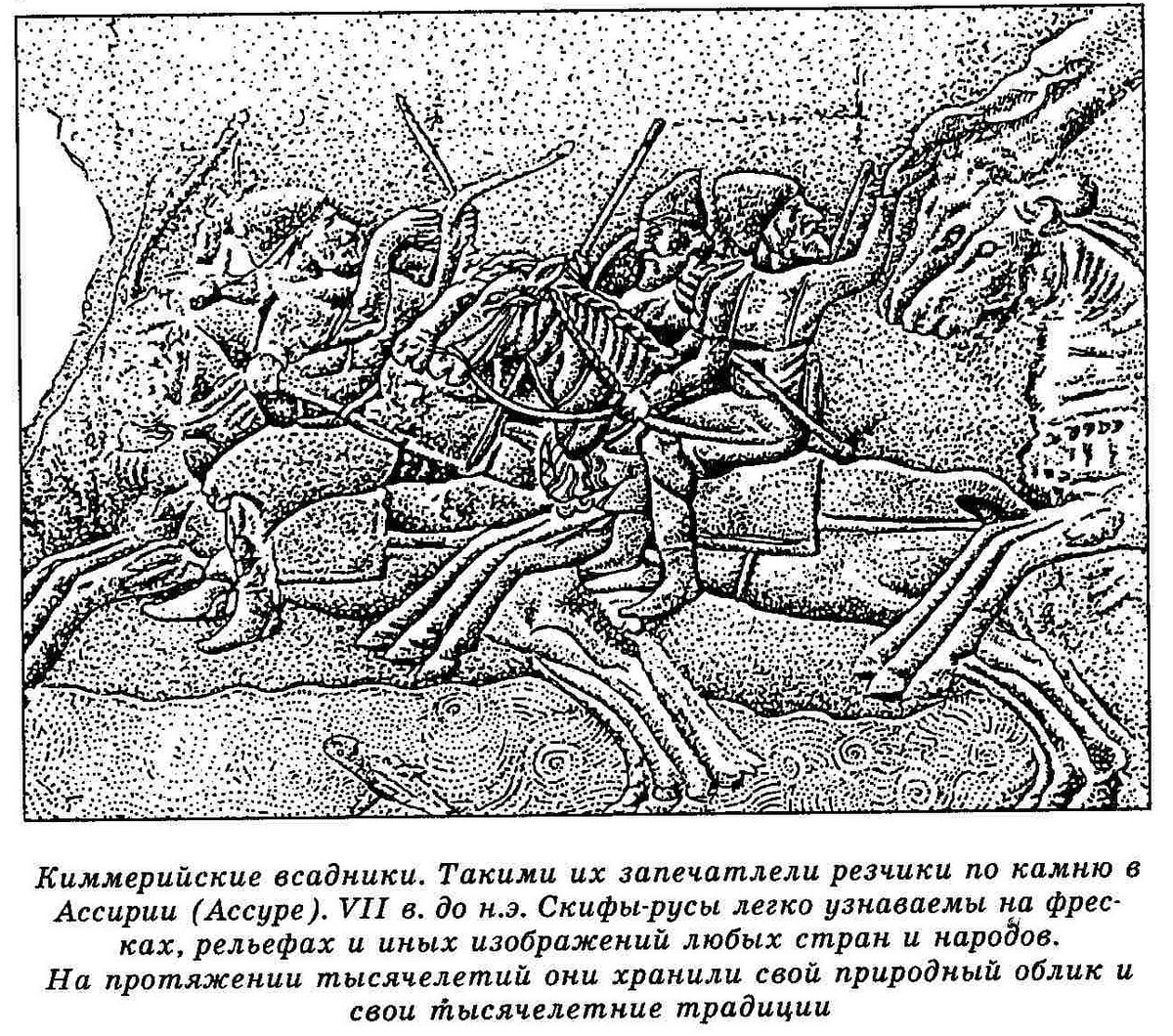 В древнегреческих источниках помимо скифов и тавров среди жителей северного Причерноморья и Приазовья упоминаются так же кимерийцы. Они жили внутри скифского государства и в этом смысле их тоже можно называть скифами. Но были и особенности. В истории упоминаются даже эпизоды войны кимерийцев со скифами. А.А. Абрашкин ("Предки русских в древнем мире", М, "Вече", 2002 г., с.176 -178) выяснил смысл названия “кимериец”. Оно оказалось переводом на древнегреческий язык русского названия ”казак”. Слово "кимера" (χίμαρος) на древнегреческом языке означало "коза" http://pylos.ru/dictionary/chi/6.html . Слово "казак" происходит от слова "коза" (в просторечье “каза”). Древним грекам, как хорошим торговцам, важно было знать: у кого что можно купить, имеющее ценность для перепродажи? Там, где жили "тавры" можно было купить для перепродажи тягловый скот - волов. У казаков можно было купить продукты, получаемые от разведения коз. Кроме названия «казак» или «кимериец» по гречески, у них было ещё одно название по тому же принципу – роду хозяйственной деятельности в мирное время. На юге России помимо коз, опять же в долинах рек, где жили казаки, всегда любили разводить ещё и гусей. Поэтому помимо названия «казак» за этим же населением ещё закрепилось название «гузы» - гуси. У них так же можно было купить продукты от разведения гусей. Названия «казаки» и «гузы» часто были эквивалентными и взаимозаменяемыми. Как отмечалось в предыдущих главах, казаки представляли собой полувоинское сословие - пограничные войска Скифского государства. Они располагались вдоль границы, но только в долинах имеющихся там рек. Поэтому названия казаков всегда связаны с какой-нибудь рекой: запорожские, донские, кубанские, терские, яицкие, казаки Семиречья (это в Средней Азии вблизи озера Балхаш) и т.д.. Насколько далеко на восток распространялись границы Скифского государства и, соответственно, культура казачества? - можно судить по тому, что «тунгусы», это тоже «гузы», или казаки. Киргизы, это искажённое «кара гузы» - «чёрные гузы» или «чёрные казаки». Здесь приведен барельеф, обнаруженный на территории бывшей Древней Ассирии с изображением кимерийцев, датируемый VII в. до н.э..