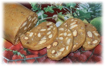 Бывает щербет шоколадный, домашний его вариант часто называют "шоколадной колбасой", а бывает молочный или сливочный щербет, его я и предлагаю сегодня приготовить. В сотейнике растопить сливочное масло, добавить сгущёнку и перемешать до однородной массы. Добавить поджаренный миндаль и поджаренные семечки. Половину печенья поломать руками, чтобы оставались небольшие кусочки, а другую половину измельчить в чоппере или мясорубке. Добавить в кастрюлю к сгущёнке и перемешать. Полученную массу выложить на пищевую плёнку и завернуть, как колбасу, края завязать. Убрать щербет в холодильник на 2-3 часа, затем извлечь из плёнки и нарезать на порционные кусочки. - 140г. сливочного масла - 1 банка сгущённого молока с сахаром (340г.) - 300г. печенья ("Юбилейное") - 70-80г. орехов (у меня миндаль) - горсть очищенных семян подсолнечника (по желанию)