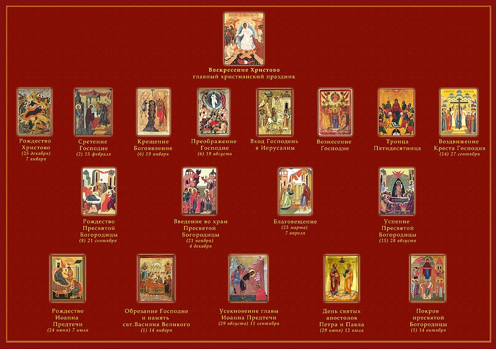 - Вознесение, Пятидесятница (Троица), Преображение и другие важные даты.
