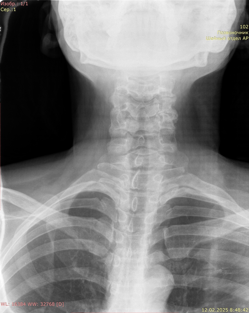 Аномалий развития не выявлено. Шейный лордоз сглажен. Ось позвоночника не нарушена. Соотношение позвонков правильное. Высота и структура тел позвонков не изменена. Субхондральный склероз замыкательных пластинок тел позвонков, неравномерное снижение высоты межпозвонковых дисков в задних отделах С3-С7. Костно-травматических и костно-деструктивных изменений не выявлено.