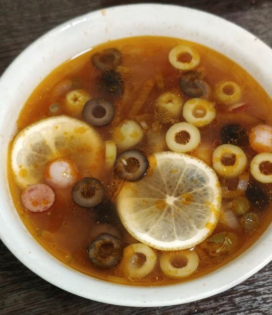 Приветствую на моем канале! Сегодня предлагаю вашему вниманию замечательную очень вкусную и сытную соляночку. Этот рецепт не из головы и тем более не из интернета. А нашла я этот рецепт в кулинарной книге, которую дедушка подарил моей бабушке в далекие 60-е прошлого столетия. Сама я ее уже много раз готовила, семья обожает этот суп, и то что предлагают в ресторанах и на просторах интернета просто ерунда, которая рядом даже не похожая. И так погнали! Для приготовления нам понадобится любой мясной или овощной бульон, я обычно беру куриный, любые колбасные изделия и копчености по вашему вкусу и карману, лук, томатная паста, оливки, маслины, каперсы, соленые или маринованные огурцы - я беру маринованные, и для подачи блюда лимон и зелень. Зелень на любителя, я не кладу. В рецепте написано во время варки супа добавить лавровый лист и перец горошком, я не кладу в суп а только когда варю бульон, и эти приправы уже при варке дают свои ароматы бульону, по этому в суп их класть нет необходимост