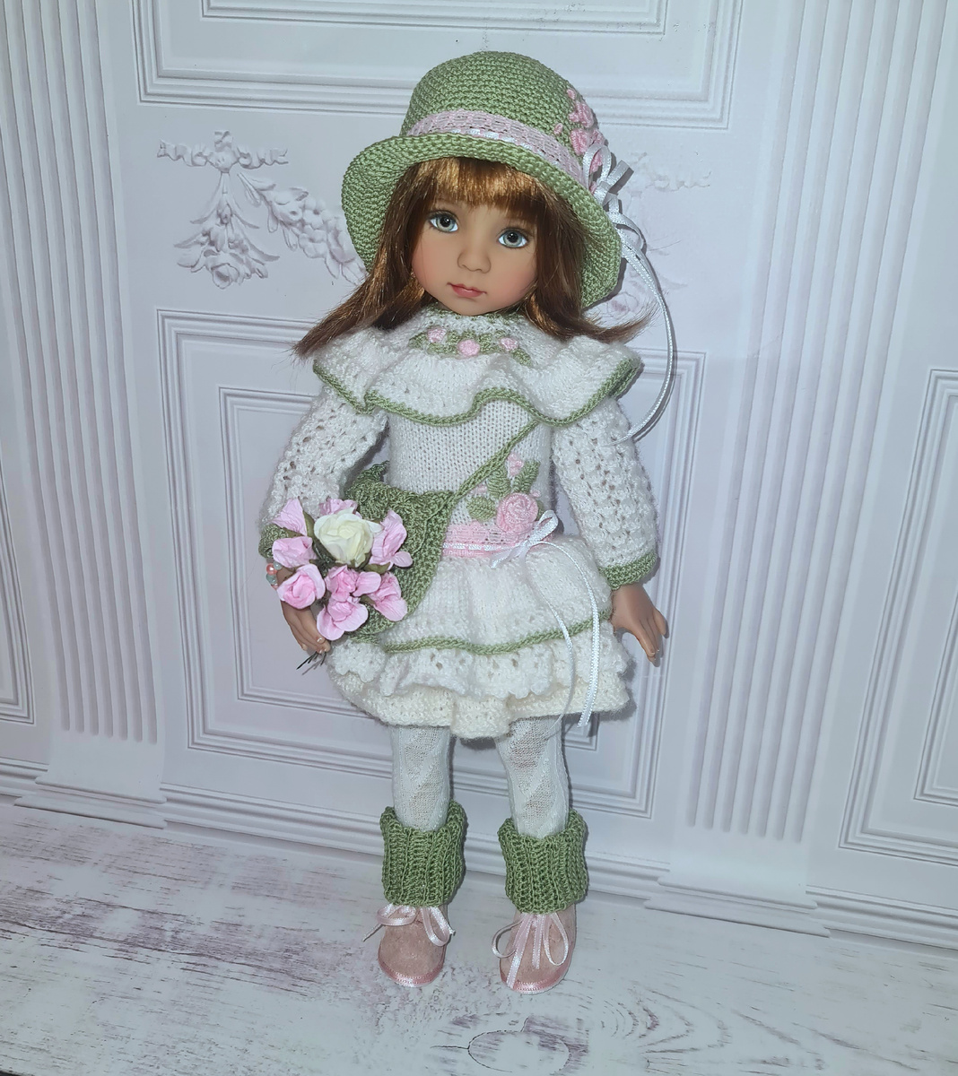 Привет всем любителям кукол, рукоделия и нашего канала. О том, кто я и чем здесь занимаюсь - читайте в закрепленном посте. Материалов здесь море на разные темы - смотрите в подборках. А сегодня я расскажу вам о своих опытах с куклами, нарядами, стилями и мозгами. Точнее, о том, что в них происходит в связи с такой деятельностью. Связала я как-то милое платьице и назвала его "Марьяша", смотрите ссылку ниже. Оно даже стало нашей визиткой, очень шло Марьяше, удобное, не мнётся в дороге, в нём мы даже на выставки ездили. Но... Подустали мы от него (и вы, наверное, тоже), и решили доделать его до полного образа. Шляпы Марьяше не идут (по возрасту и стилю), поэтому платье забрала новая куколка Little Darling. О ней - по ссылке ниже: Этим куклам шляпки, цветы, розочки-вышивки, ленточки-кружева - вот самое оно. Рыженькой "девочке" очень к лицу этот болотно-мутно-зелёный цвет. Сумочку связали по своему же описанию: Розовые ботиночки сделали в тон вышивке: Ну, ещё гетры, букетик в руки, хотело