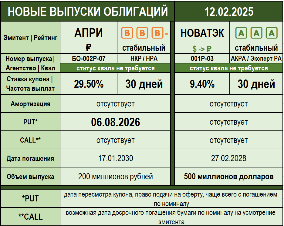 😉 Утренней бодрости, дамы и господа! Проводником по миру новых выпусков станет традиционный пост, который сегодня навестили два эмитента! ✅ Девелопер и инструмент валютной диверсификации сегодня после обеда навестят стаканы и начнут торги: 〰️〰️〰️〰️〰️〰️〰️〰️〰️〰️ ⛄️ АПРИ БО-002Р-07 📊 🅱️🅱️🅱️➖ 🔹 ISIN: $RU000A10AUG3 ▪️Купон фиксированный: 29,5% ▪️PUT-оферта через 1,5 года ▪️ Погашение через 5 лет ▪️ Рейтинговый отчет: ➖ https://ratings.ru/ratings/press-releases/APRI-RA-070824/ ➖ https://www.ra-national.ru/press_release/39320/ Девелопер, бумаги которого уже лезут из ушей ввиду появления на рынке с завидной частотой. Но этот выпуск, пожалуй, с самыми непривлекательными условиями и все с теми же повышенными рисками. Компания сменила организатора размещения, и почему-то решила, что заплатить за это должны поклонники облигаций через снижение купонной ставки. Если перед новым годом эмитент предлагал 34% на год в выпуске 002Р-08 $RU000A10AG48, то теперь готов дать на 4,5% меньше при неиз