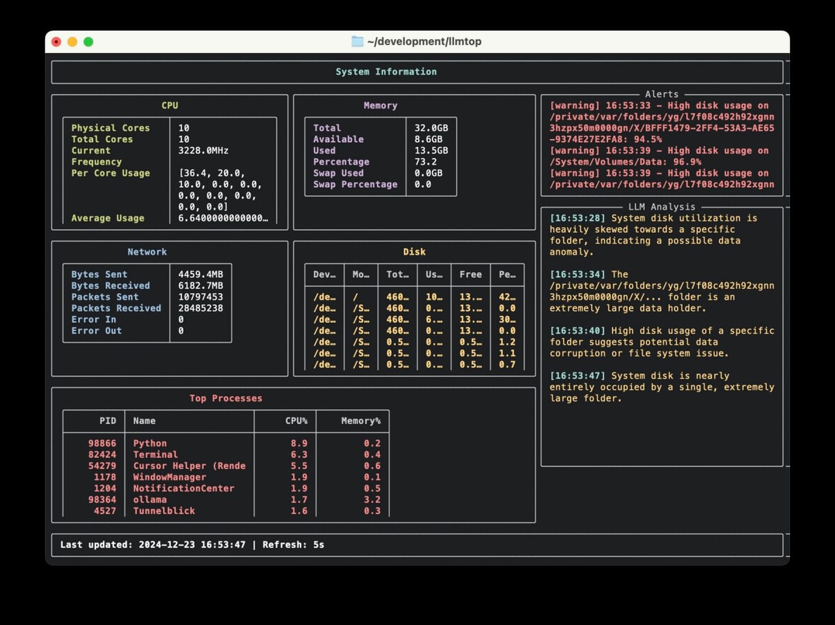 llmtop — инструмент мониторинга системы на базе LLM, который в режиме реального времени предоставляет информацию о производительности вашей системы.