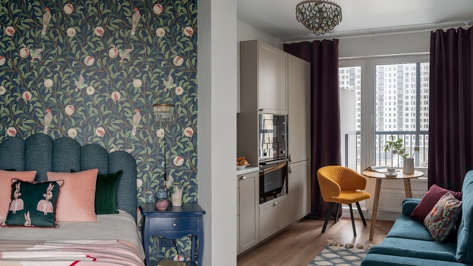 Обои от застройщика покрасили в нейтральный бежевый на кухне и в прихожей, в спальне сделали акцент с помощью зеленого цвета; в изголовье кровати, которую разместили в алькове, поклеили обои на заказ. Выбрали рисунок в стиле Уильяма Морриса, знаменитого британского художника 19 века, основателя одноименной компании, которая сегодня производит обои, ткани, краски.