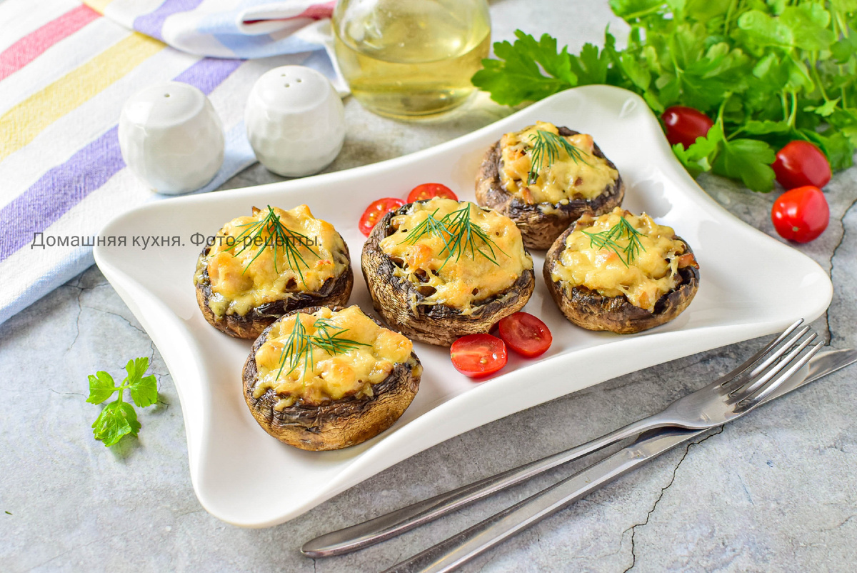 Простая и вкусная закуска для праздничного стола. Для приготовления выбирайте крупные шампиньоны. Учитывайте, что после запекания они уменьшатся в размере. Для приготовления подготовьте необходимые ингредиенты. Для начинки можно взять мясо курицы или индейки. И то, и другое готовится достаточно быстро. Шампиньоны промойте от загрязнений и сразу обсушите, чтобы они не размокли. Удалите у грибов ножки. Ножки измельчите вместе с луком. Мясо птицы мелко нарежьте и обжарьте 10-12 минут. Затем добавьте грибы с луком. Обжарьте все вместе еще минут 5-7. По вкусу подсыпьте соль и специй. В каждый шампиньон добавьте немного майонеза. Наполните грибы обжаренной начинкой. Посыпьте тертым сыром. Выложите грибы в форму для запекания и поставьте в духовку, предварительно разогретую до 180 градусов, примерно на 20-30 минут. Ориентируйтесь по своей духовке. Грибы стали мягкие и немного уменьшились в размере. Сыр начал подрумяниваться. Выложите готовые шампиньоны на тарелку и подавайте к столу. Приятног