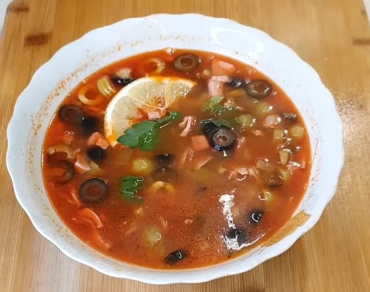 🍲Рецепт классической солянки с ароматными копченостями) -Говядина (на бульон) – 300 г -Копчёности (ветчина, копчёная колбаса, бекон) – 300 г -Охотничьи колбаски – 2 шт. -Лук – 2 шт. -Морковь – 1 шт. -Маринованные огурцы – 3–4 шт. -Томатная паста – 2 ст. л. -Маслины без косточек – 100 г -Лимон – 1 шт. -Растительное масло – 2 ст. л. -Вода – 1,5–2 л -Лавровый лист – 2 шт. -Перец горошком – 5–6 шт. -Соль, перец – по вкусу -Зелень (укроп, петрушка) – для подачи -Сметана – для подачи 1. Говядину залейте холодной водой, доведите до кипения, снимите пену. Добавьте лавровый лист и перец горошком, варите на слабом огне 1–1,5 часа. Достаньте мясо, нарежьте его кубиками. 2. Лук мелко нарежьте, морковь натрите на тёрке. Обжарьте овощи на растительном масле до золотистого цвета. Добавьте томатную пасту и тушите 3–4 минуты. 3. Копчёное мясо и колбаски нарежьте кубиками, слегка обжарьте на сухой сковороде до румяности. 4. Маринованные огурцы нарежьте мелкими кубиками. Можно слегка обжарить их
