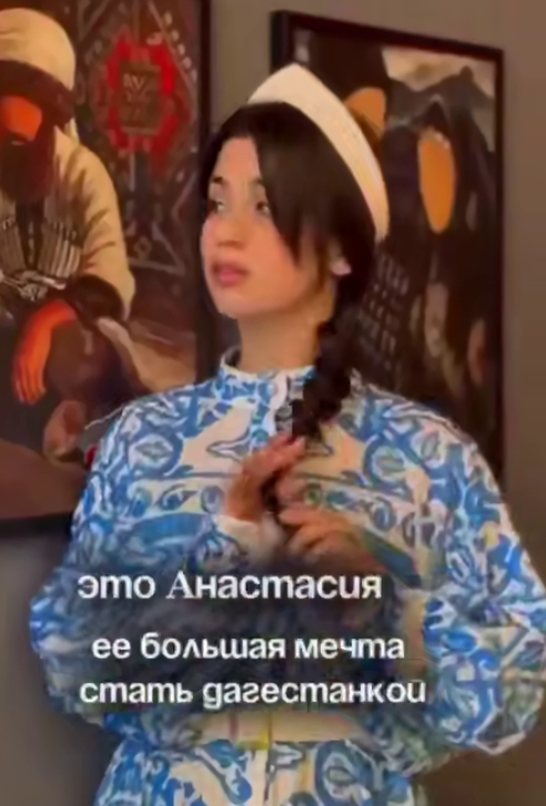 Видеоролик: молодая девушка в русском сарафане и кокошнике, нелепыми движениями пытается «быть дагестанкой». Голос за кадром снисходительно комментирует её жалкие попытки соответствовать чужой культуре: “Большая мечта Анастасии быть дагестанкой”, джурабки не налезли, платок сползает, национальную литературу не осилила. Надежда была только на «раф с узбечом». И вот, чудо! Выпив этот кофе, она превращается в элегантную девушку в национальном наряде и, наконец, ведёт себя «достойно». И теперь это уже не Анастасия, а Аида!