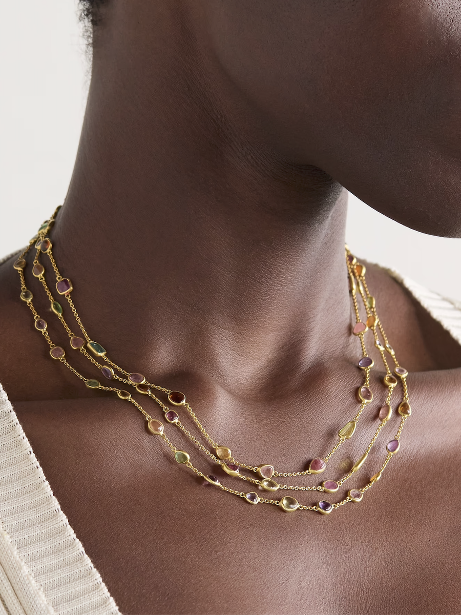 Сочетание двух-трёх подвесок разной длины, комбинирование тонких цепочек, жемчужных нитей и небольших кулонов. Причём в "слоях" могут сочетаться разные цвета, разные фактуры и разные материалы.