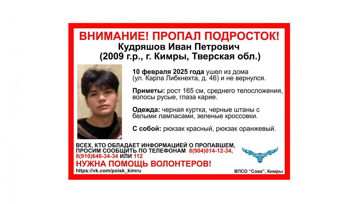 Более детальные приметы и фотография Ивана представлены в ориентировке. Волонтёры обращаются к жителям Тверской области с просьбой помочь в поисках подростка.
