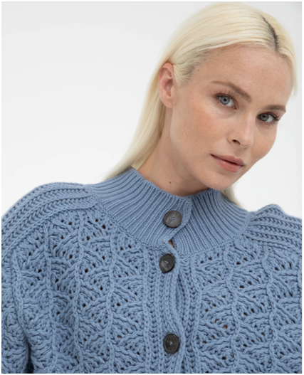 Укороченный кардиган связан снизу вверх отдельными деталями: передние полочки, спинка, рукава. При этом кардиган имеет интересную констукцию: центральная часть рукава, состоящая из нескольких петель ангилийской резинки, продолжается в виде погона до горловины кардигана. Судя по всему, рукава связаны отдельно с удлиненной центральной частью, а передние полочки и спинка вяжутся не до плечевого шва, а, соответственно, до такой высоты, чтобы их можно было состыковать с удлиненной частью рукава. Такую конструкцию можно назвать "реглан-погон снизу". Высокой ворот и манжеты рукавов связаны резинкой со скрещенными петлями, также, как и узкая планка по низу кардигана. Планки полочек связаны английской резинкой.