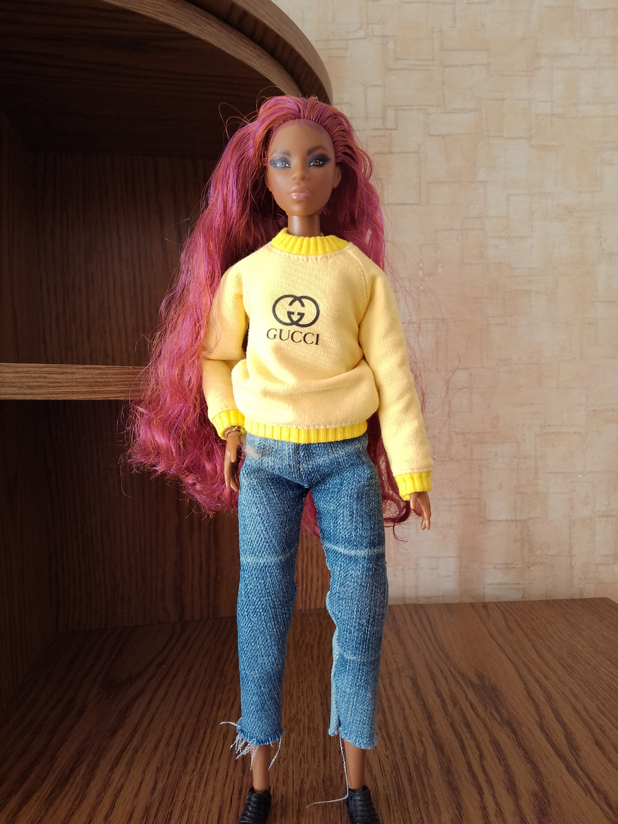 Добрый день. Как я уже писала, Тамика, которая у меня присутствует в коллекции давно, но на статичном теле, получила тело МТМ типа atletic. Это тело йоги Бруклин. Честно говоря я думала, что йоги по качеству как looks... Наивная). Но вариант этот был ооочень выгодным, и вот так теперь. Тамика- одна из самых сложных кукол в моей коллекции. Далеко не всем моим куклам мешает статичное тело. Её же они прямо таки тяготило. И некоторое время уже я искала ей родное тело на авито. Стоит оно там как новая кукла, а это в мой бюджет не вписывалось. И вот- выход нашёлся. За 900 р придираться к телу МТМ, новому, не открепленному от коробки- ну это уже глупо). Джинсы нам сели от пышки. Вообще ни одни штаны стандартной Барби на накачанные ножки не садятся. Жёлтый, судя по детским фото, был любимый цвет Тами. Имя пока под вопросом, мы с ней ещё не решили. Девочки решили помочь новенькой старушке Тами найти свой стиль, поделились одеждой. Классика Бохо "Хищница" Пальто Магдалены ей, по-м