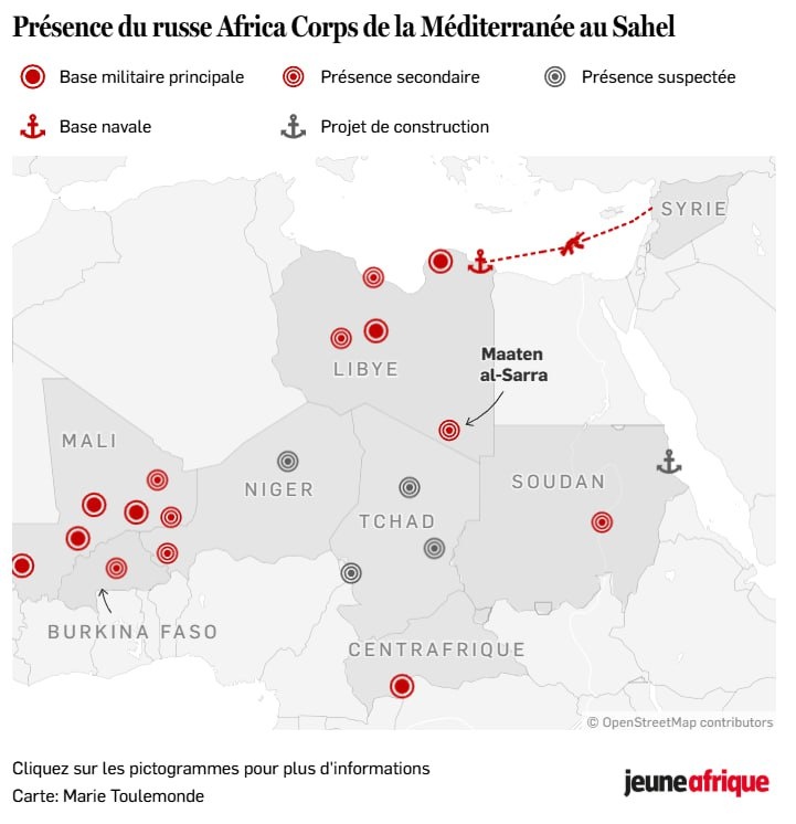 Сообщает издание «Молодая Африка», и ссылаясь на собственные источники, фиксирует присутствие Африканского корпуса в Чаде. «В Нджамене у них даже есть свой магазин», уверено издание 😅 В пользу этой версии также говорят работы по реконструкции аэропорта Маатен аль-Сарра, расположенного на юге Ливии, на границе с Египтом, Суданом и Чадом, на расстоянии 100 км. от каждой из сторон. Аэропорт находится в центральной точке новой сферы влияния России в Африке. В перспективе его запуск в эксплуатацию позволит обслуживать без дозаправки авиабазы Ниамей в Нигере, Лумбила в Буркина-Фасо и Гао в Мали, а также будущую военно-морскую базу в Порт-Судане. Есть и более глобальная цель. Москва создает воздушный мост между Средиземноморьем и Сахелем. Фиксирует в своем новом расследовании издание. По мнению журналистов Россия формирует логистический узел объединяющий целый архипелаг баз, простирающихся от северной Ливии до юга Центральноафриканской республики (см. карту). Цель — облегчить переброску л