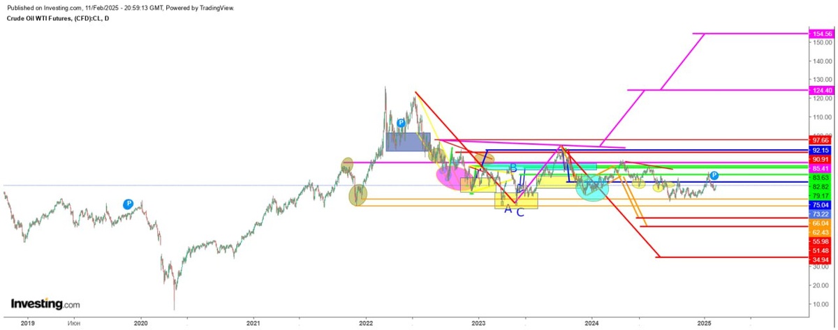 ❄️ Всем добрый день и позитивного настроения! Вот уже и зима подходит постепенно к своему завершению, а мы с октября не обсуждали ситуацию в нефти - вот тут был прошлый обзор А что обсуждать, если уже 5,5 месяцев цена находится в жестком и нудном боковом движении Не будем сильно вдаваться в подробности, но по сути в нефти остаются все те же цели, как внизу, так и вверху И разумеется все те же уровни необходимо пробивать, чтобы достичь целей, в любом направлении Важно отметить, что паттерн АВС создаваемый весною 2023 года - по-прежнему не сломан и он является сейчас ключевым для роста Кроме того за последние 5,5 месяцев начиная с сентября 2024 года, цена очень неплохо проторговала диапазон, который в свечном анализе принято называть "крепость" - иными словами цена создала мощный уровень поддержки Он обозначен на втором графике оранжевым прямоугольником Вот и в этом году цена отталкивается от него и снова пробует подрастать Несмотря, на то, что Дональд Трамп призывает - Drill Это не зна