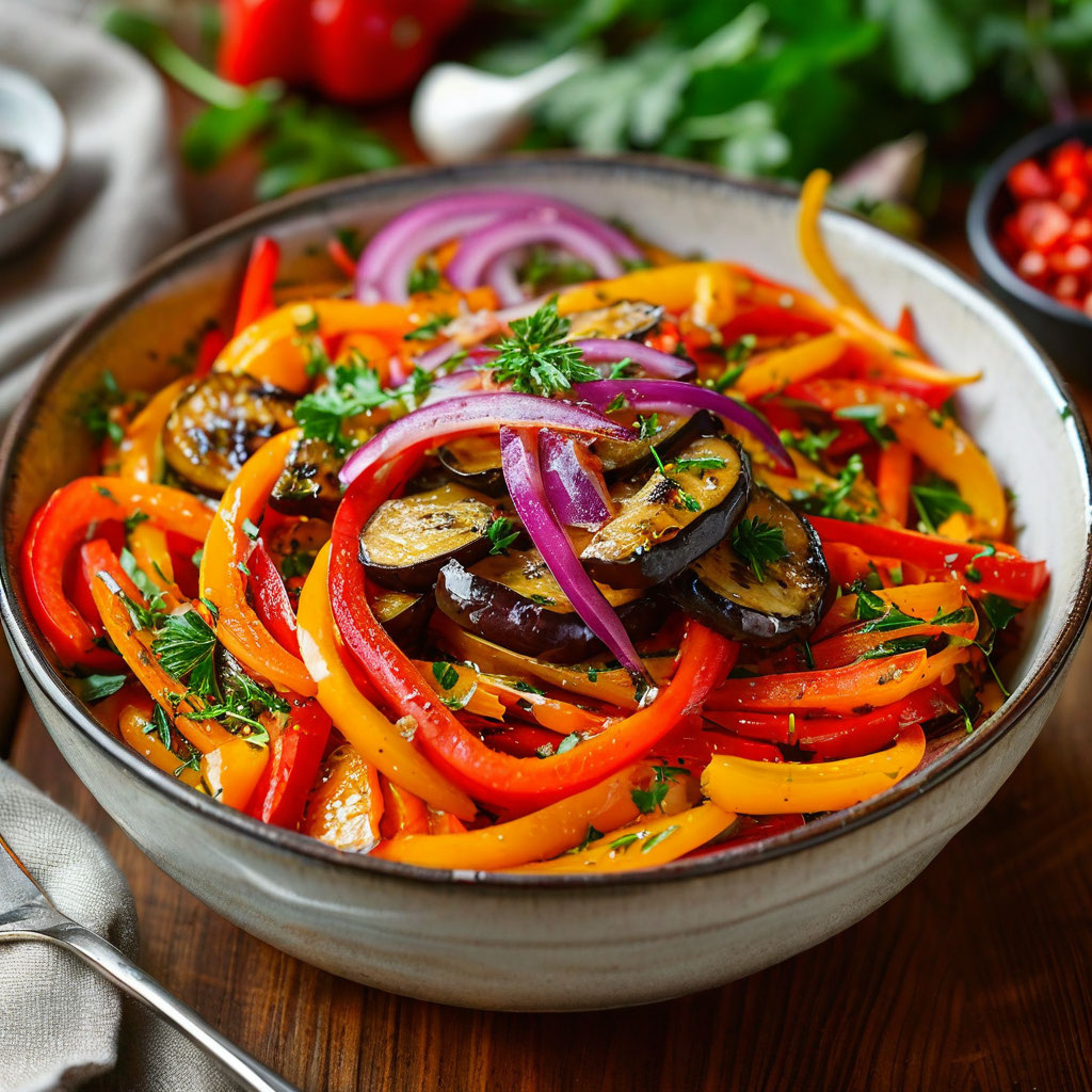 Азиатские салаты — это буйство красок, вкусов и текстур. Представьте себе идеальное сочетание свежих и обжаренных овощей, дополненное ароматной кунжутной заправкой и пряными специями. Этот овощной салат станет настоящим кулинарным шедевром на вашем столе, а его приготовление займёт всего 30 минут. ИНГРЕДИЕНТЫ: · Баклажан – 1 шт. · Кунжутное масло – 2 ст.л. · Сладкий перец – 0,5 шт. · Морковь – 0,5 шт. · Красный лук – 0,25 шт. · Перец Чили – 0,5 шт. · Кинза – 50 г · Вода – 1 ч.л. · Рисовый уксус – 1 ч.л. · Приправа универсальная – 0,25 ч.л. ПОШАГОВЫЙ СПОСОБ ПРИГОТОВЛЕНИЯ: Шаг 1 Нарежьте баклажаны толстыми ломтиками. Раскалите на сковороде 1 ст.л. кунжутного масла и обжарьте баклажаны небольшими партиями до золотистого цвета. Переложите в салатник и дайте немного остыть. Шаг 2 Перец, морковь и лук нарежьте тонкой соломкой. Добавьте в салатник. Шаг 3 Измельчите чили, очищенный от семян, и кинзу. Добавьте в салатник. Шаг 4 В небольшой ёмкости смешайте универсальную приправу с гор